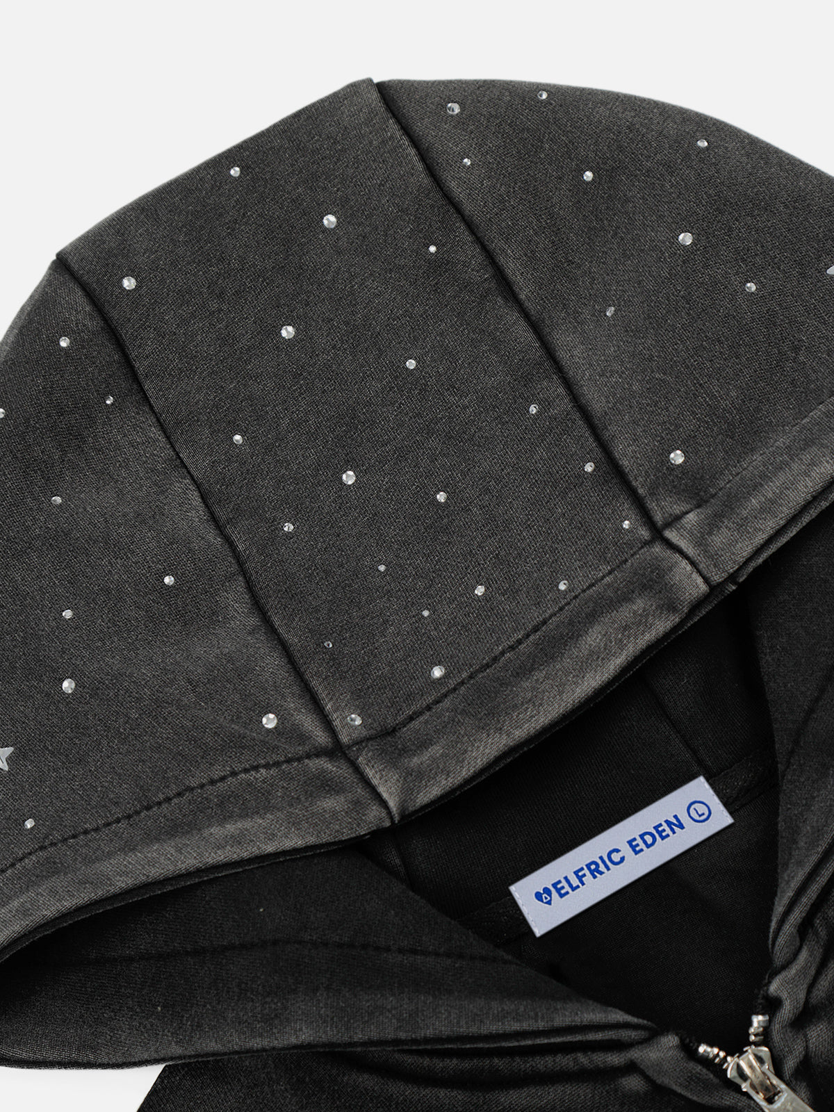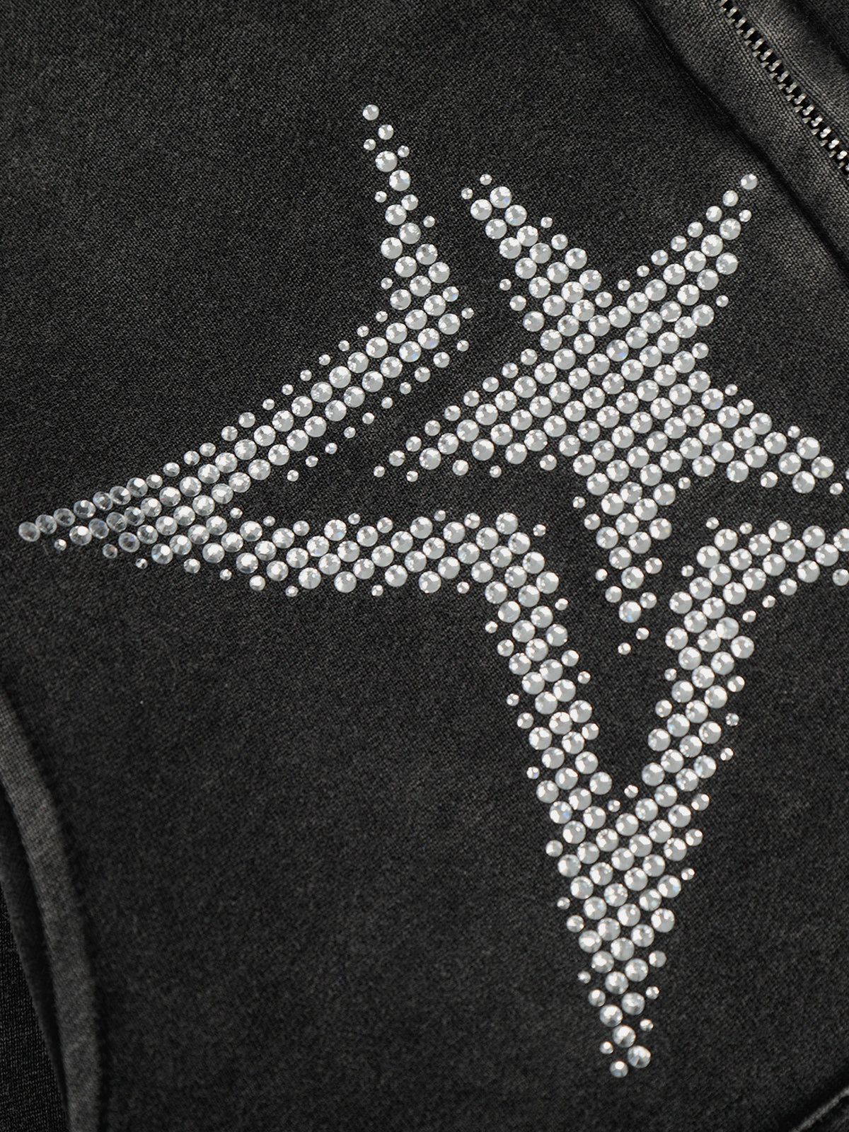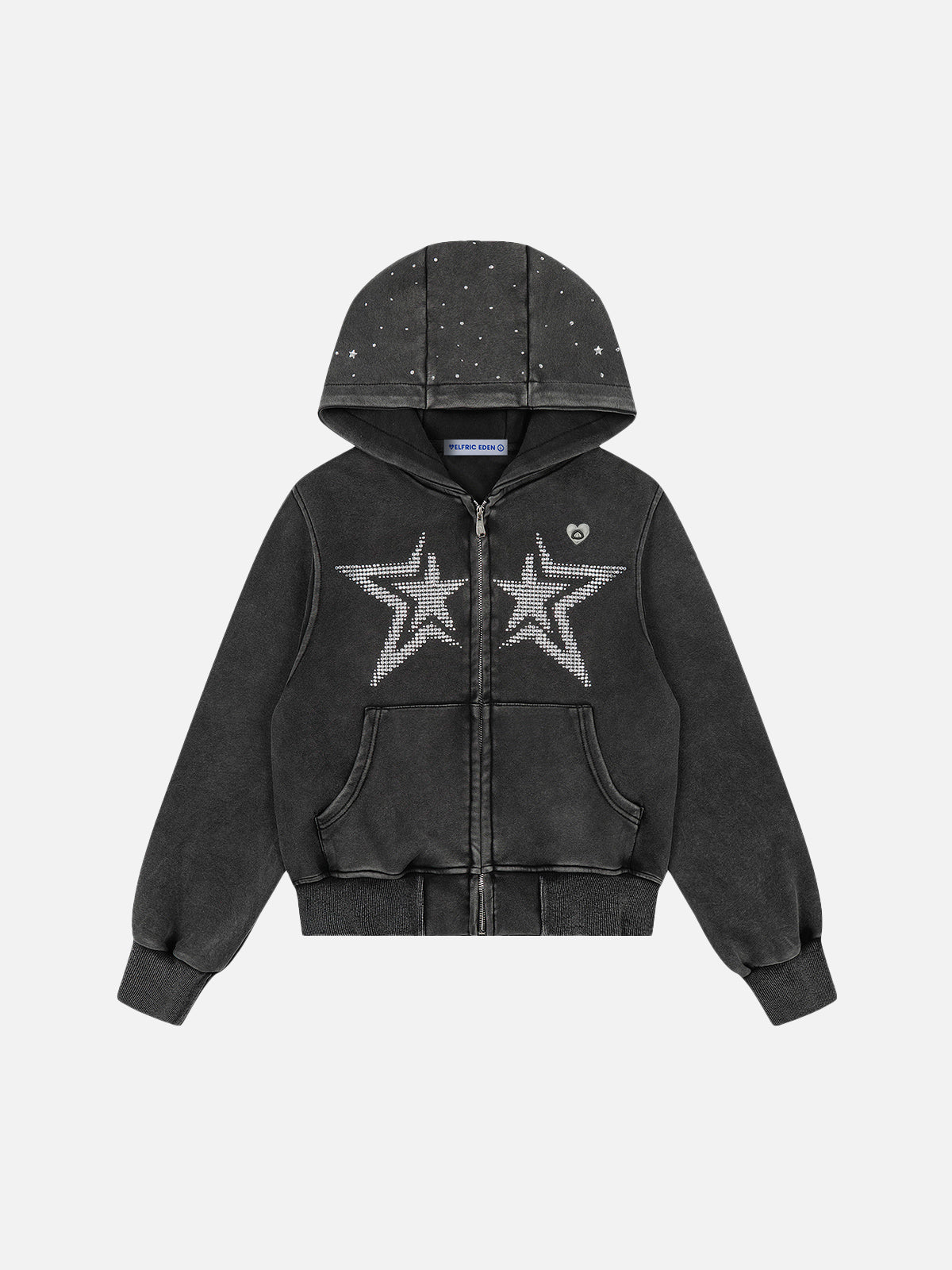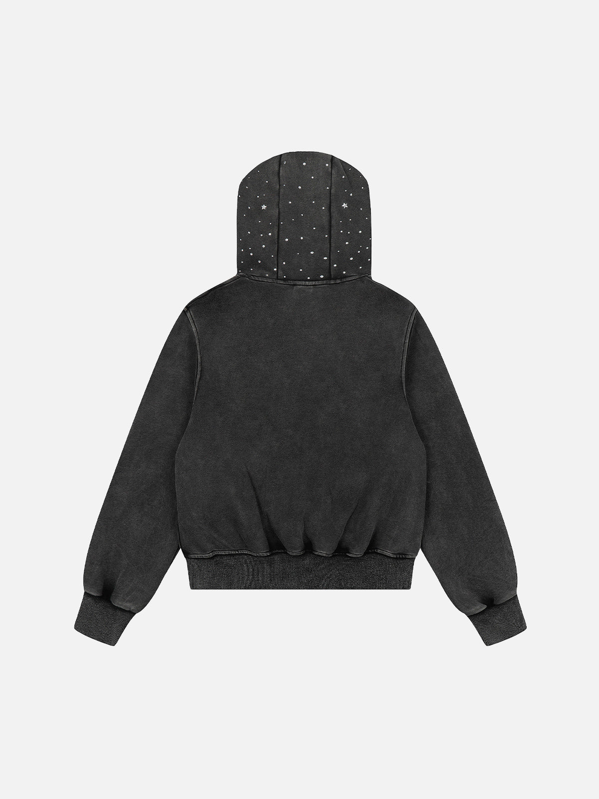 Designed in a cropped proportion with a washed charcoal finish for a worn-in depth. Dual rhinestone star motifs dominate the front, creating a reflective focal point, while scattered stud detailing extends across the hood. Ribbed trims and a full zip closure complete the structured silhouette with a sharp, compact edge.