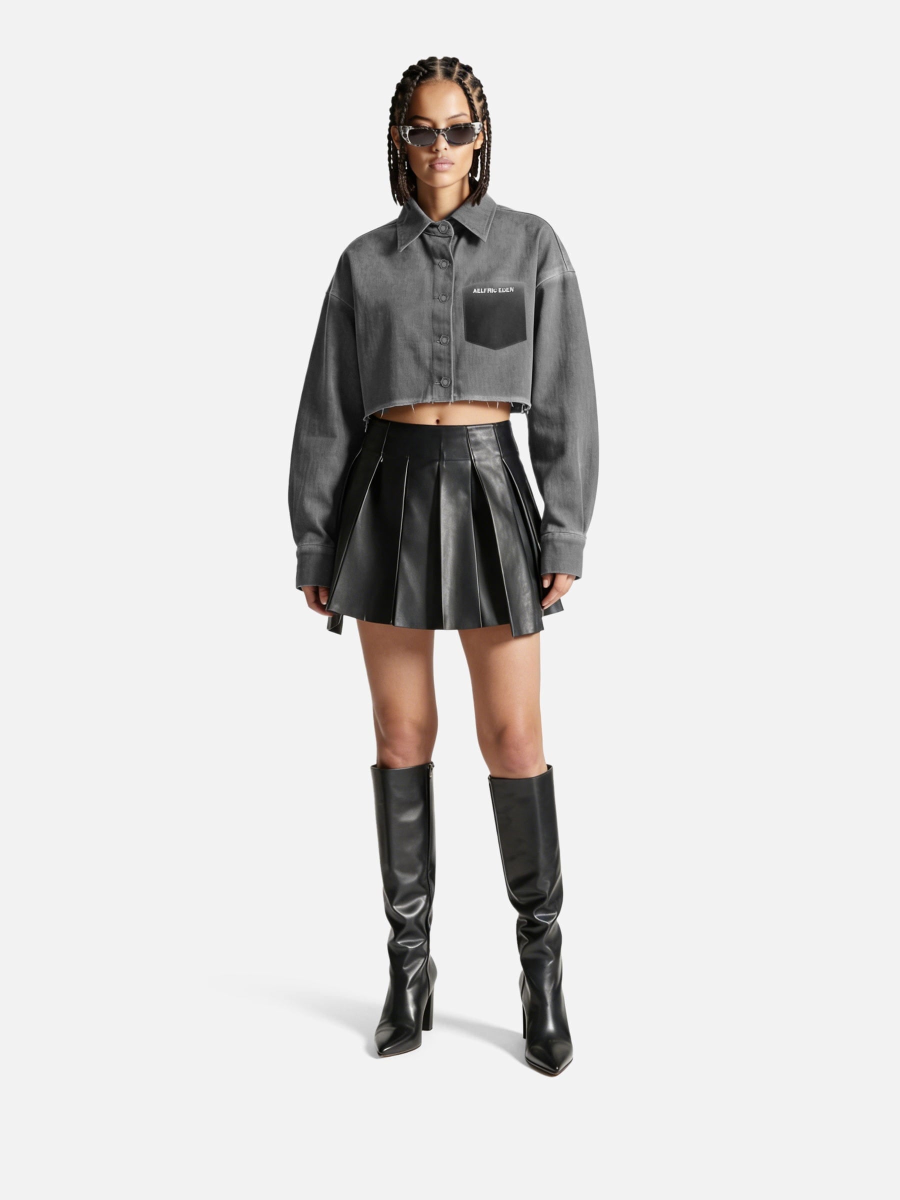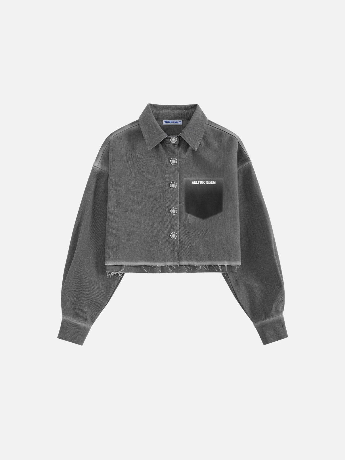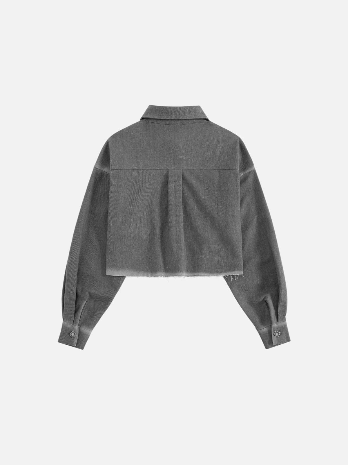 This long sleeve shirt is designed with a cropped silhouette and a clean, structured hem. Featuring a classic collar, button-up front, and a single chest pocket, it keeps the shape sharp while adding a washed finish for subtle texture. Easy to style alone or layer, it works as a lightweight outer or statement top.