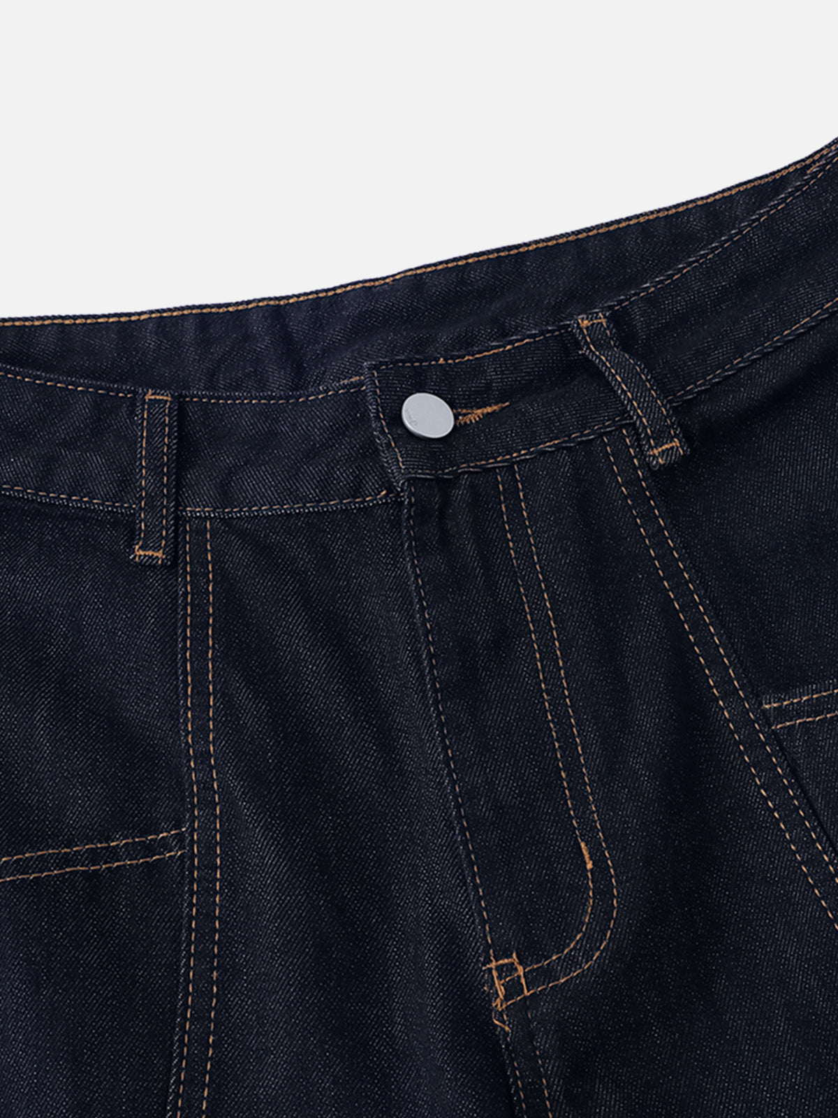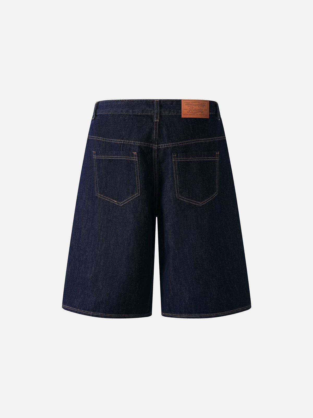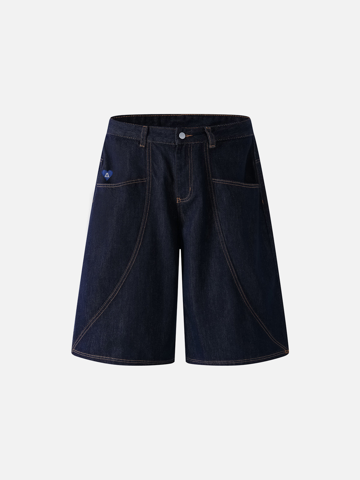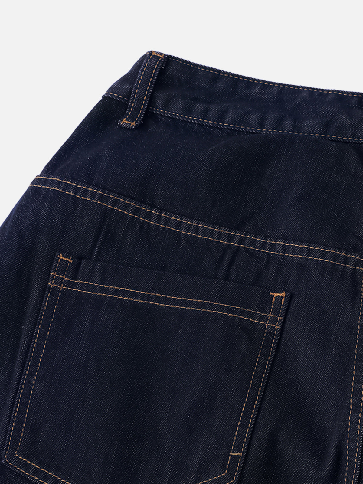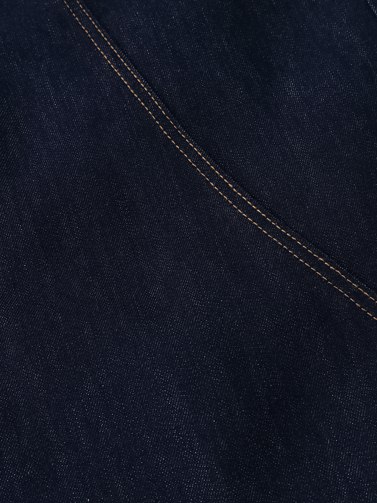 Designed with an extended length and sculpted curved seam panels that build volume through the leg. Deep indigo denim is framed by contrast topstitching, giving the structure a defined edge while maintaining a clean surface. The longer cut enhances proportion and movement with a grounded finish.