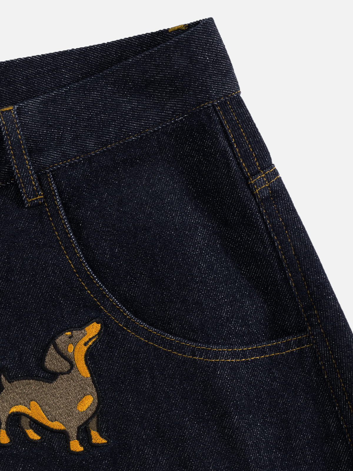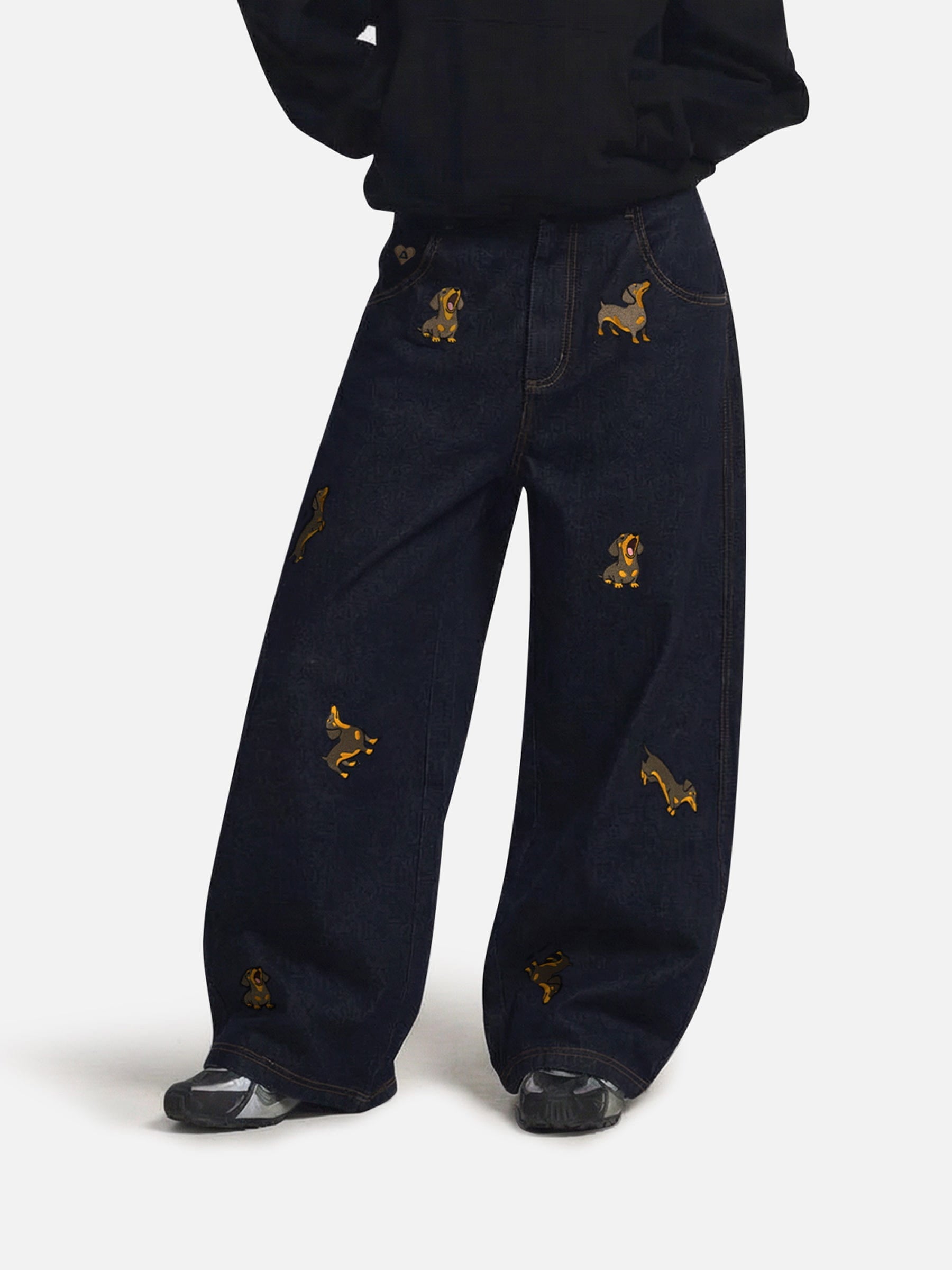 Dachshund embroidery is stitched across the denim, adding a playful yet tactile touch to the surface. The baggy silhouette keeps the fit relaxed and effortless, while the embroidered graphics bring personality without feeling loud. Easy to style, expressive, and naturally aligned with everyday streetwear looks.