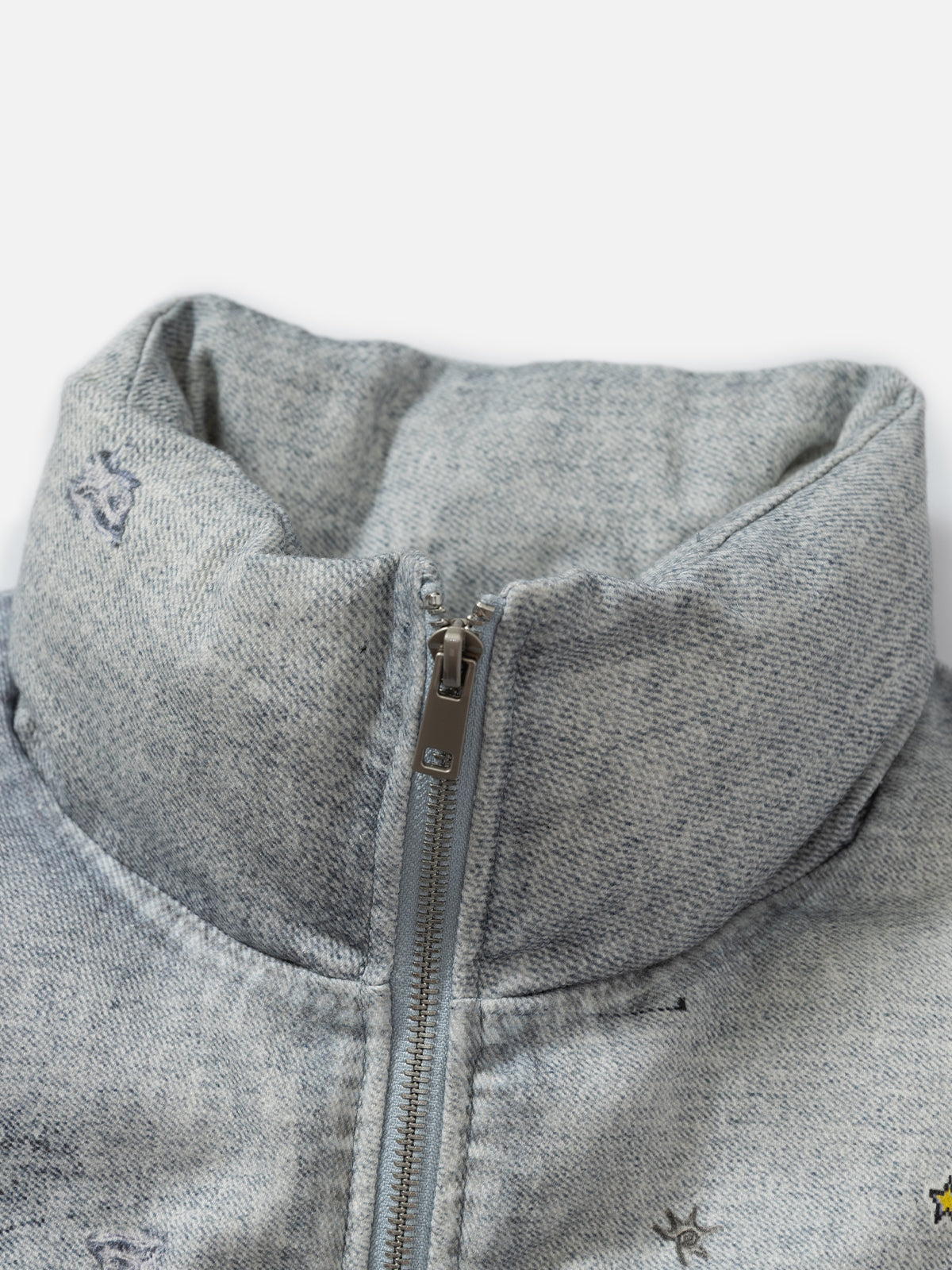 Denim Graphic Coat with a stand collar brings a fresh twist to classic denim outerwear. Detailed with expressive graphics and subtle fading, it blends structured form with a laid-back attitude for an effortlessly cool look.