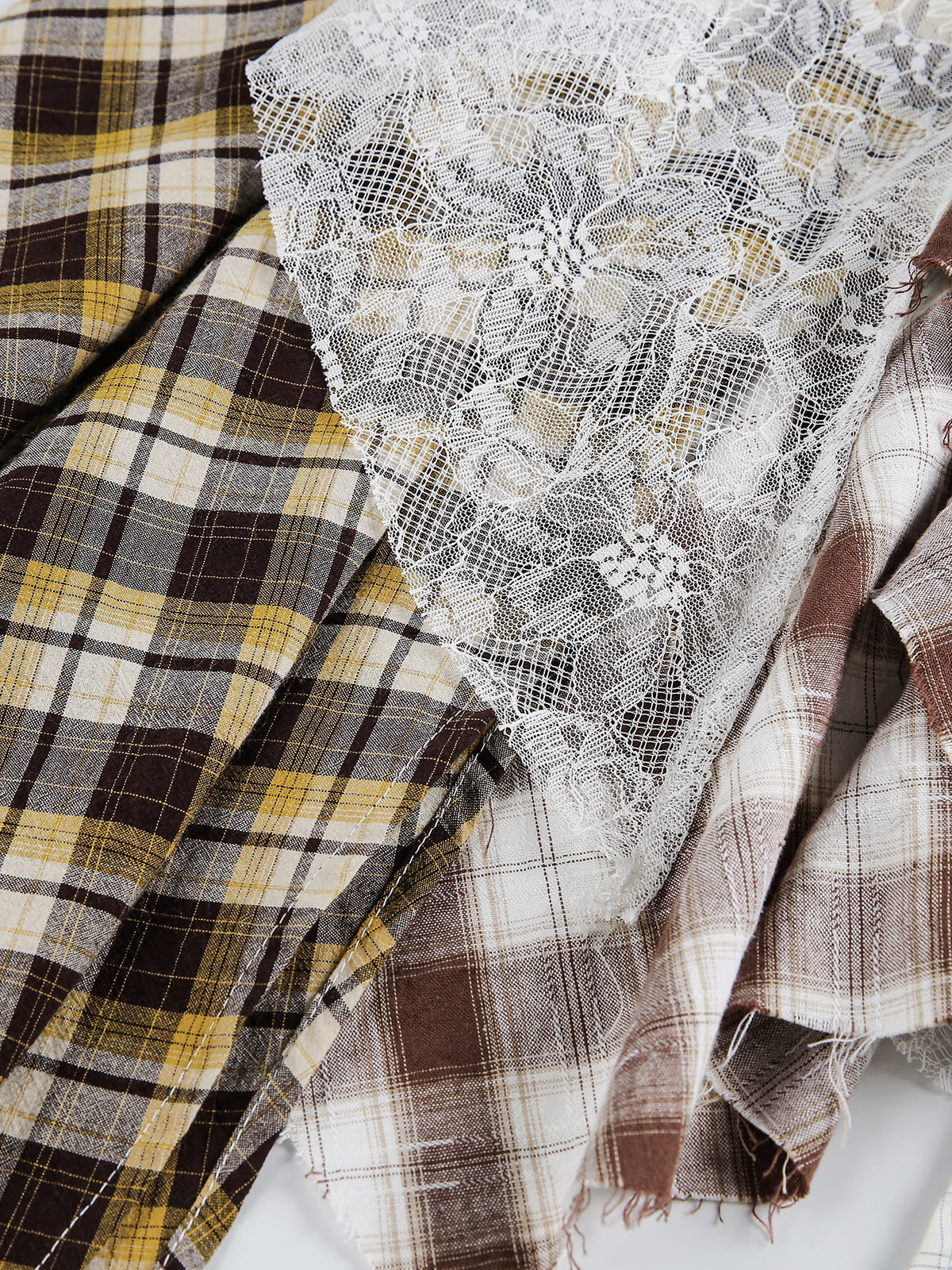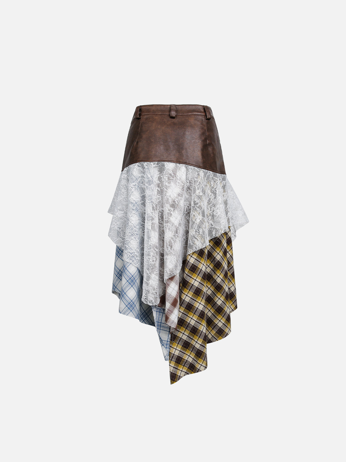 Constructed with a structured faux leather waist panel, this piece is layered with cascading lace and mixed plaid panels for a deconstructed silhouette. The asymmetrical drape creates movement and depth, while the contrast of textures balances sharp structure with soft flow. Finished with a defined waistband and multi-fabric construction for a dimensional, layered look.