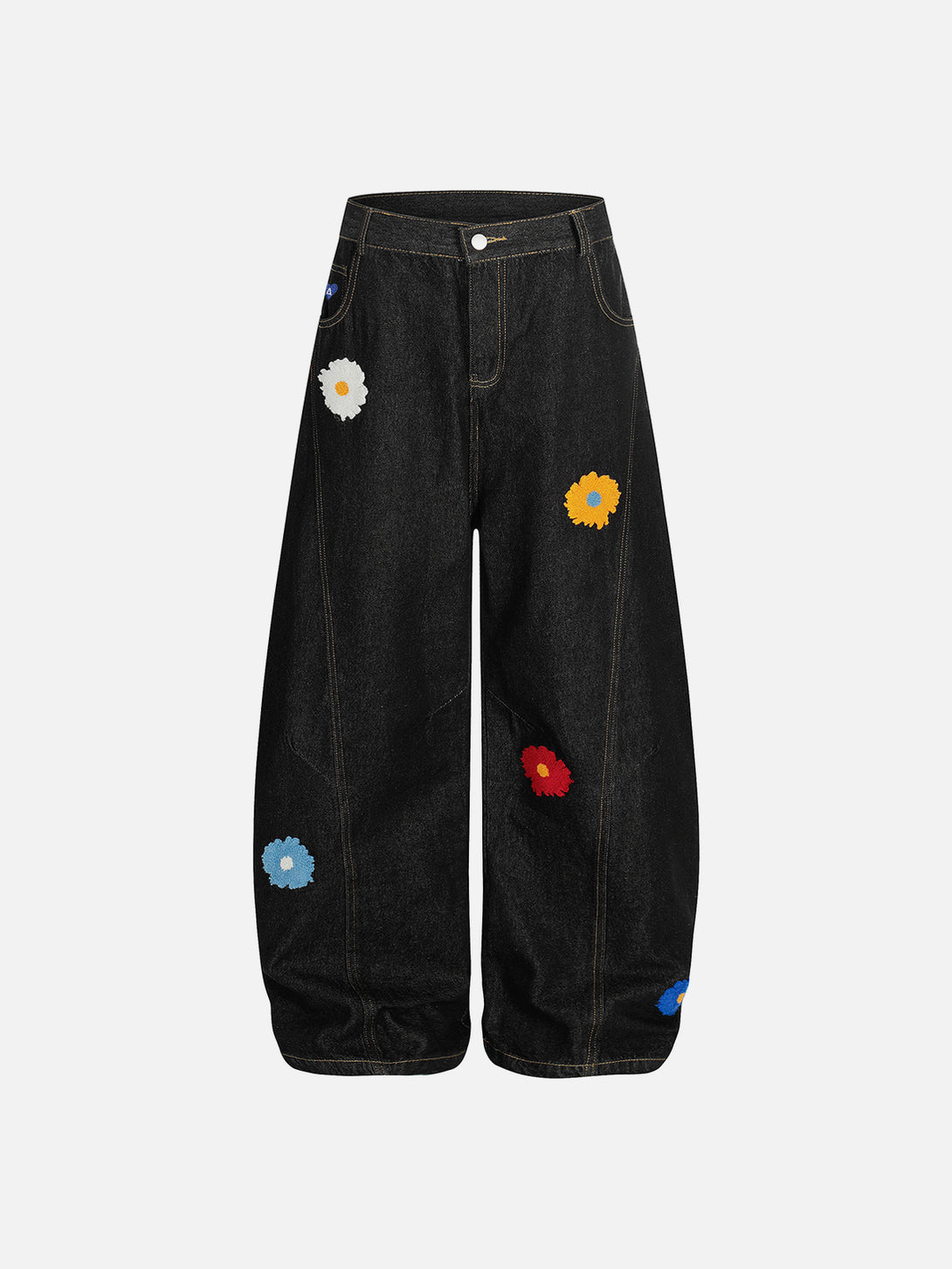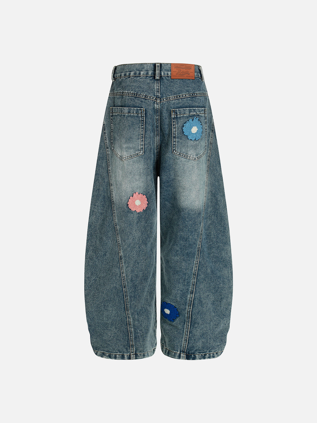 Delicate floral embroidery adds a soft contrast to the Floral Embroidery Baaggy Barrel Jeans, featuring a relaxed baggy barrel silhouette that blends casual comfort with artistic, street-inspired style.