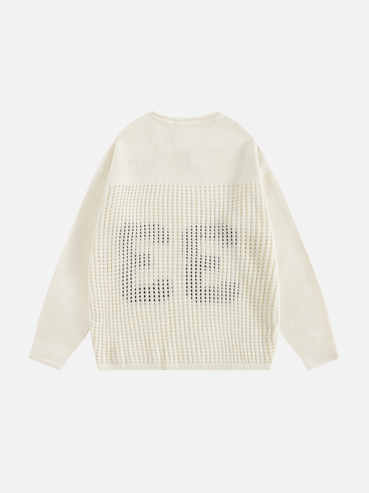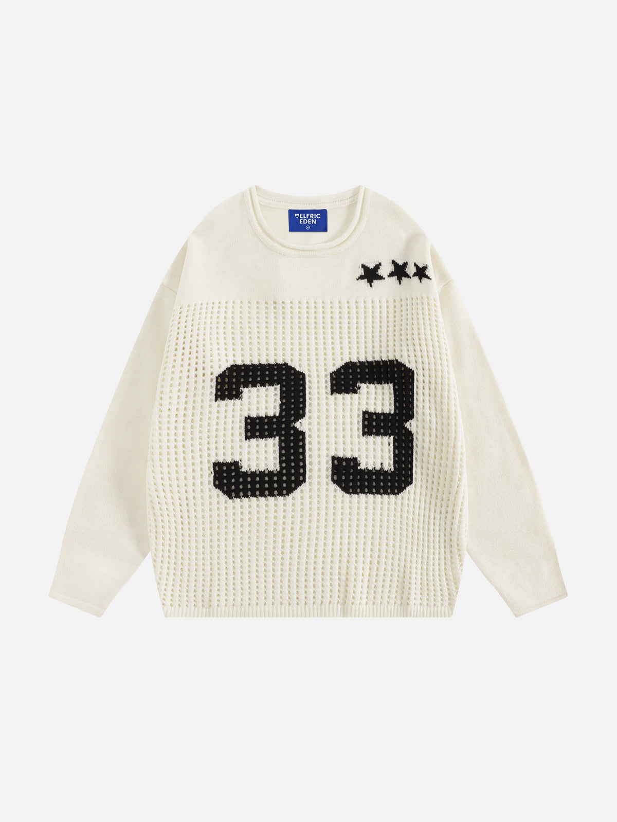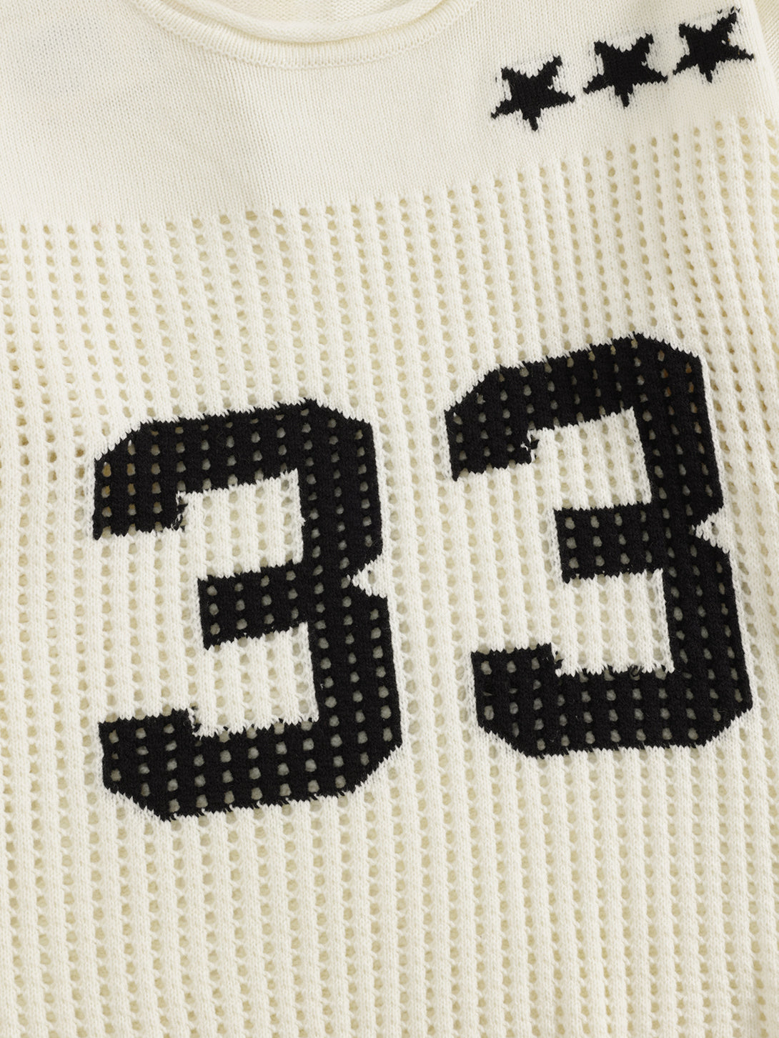 This sweater mixes sporty attitude with a textured twist.The bold number graphic pairs with an eyelet knit pattern, giving the piece a breathable, dimensional look that stands out without trying.Soft yarn keeps it comfortable for everyday wear, while the playful star detail adds a subtle touch of character.
