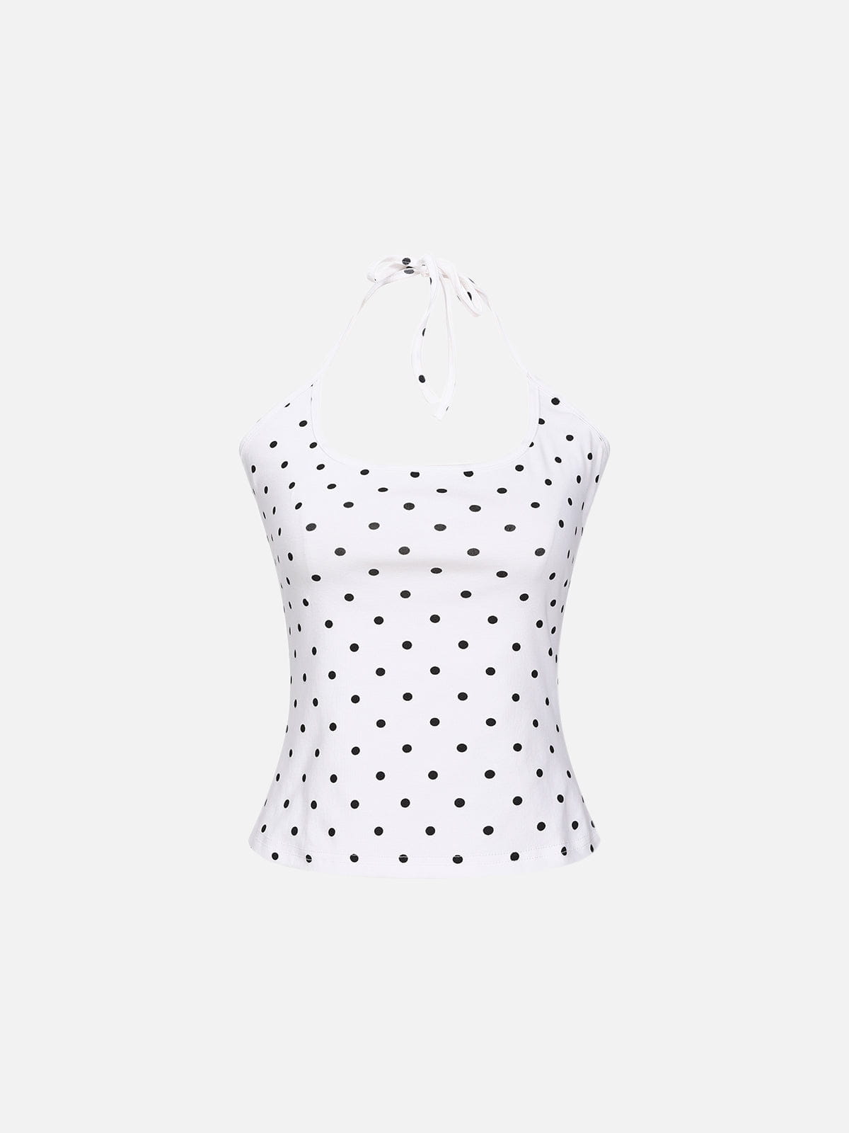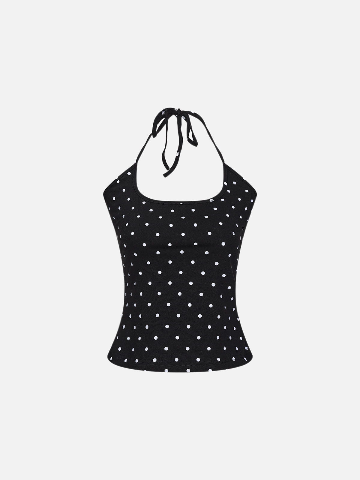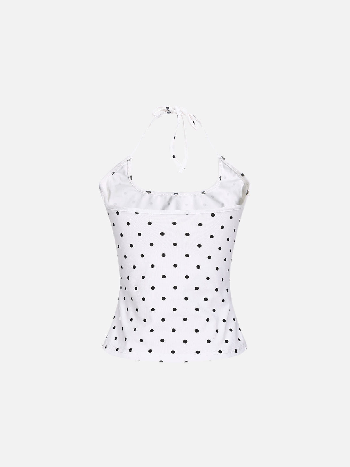 All-over polka dot print with a halter tie neckline. Fitted cami silhouette enhances shape while keeping a clean, retro-inspired look.
