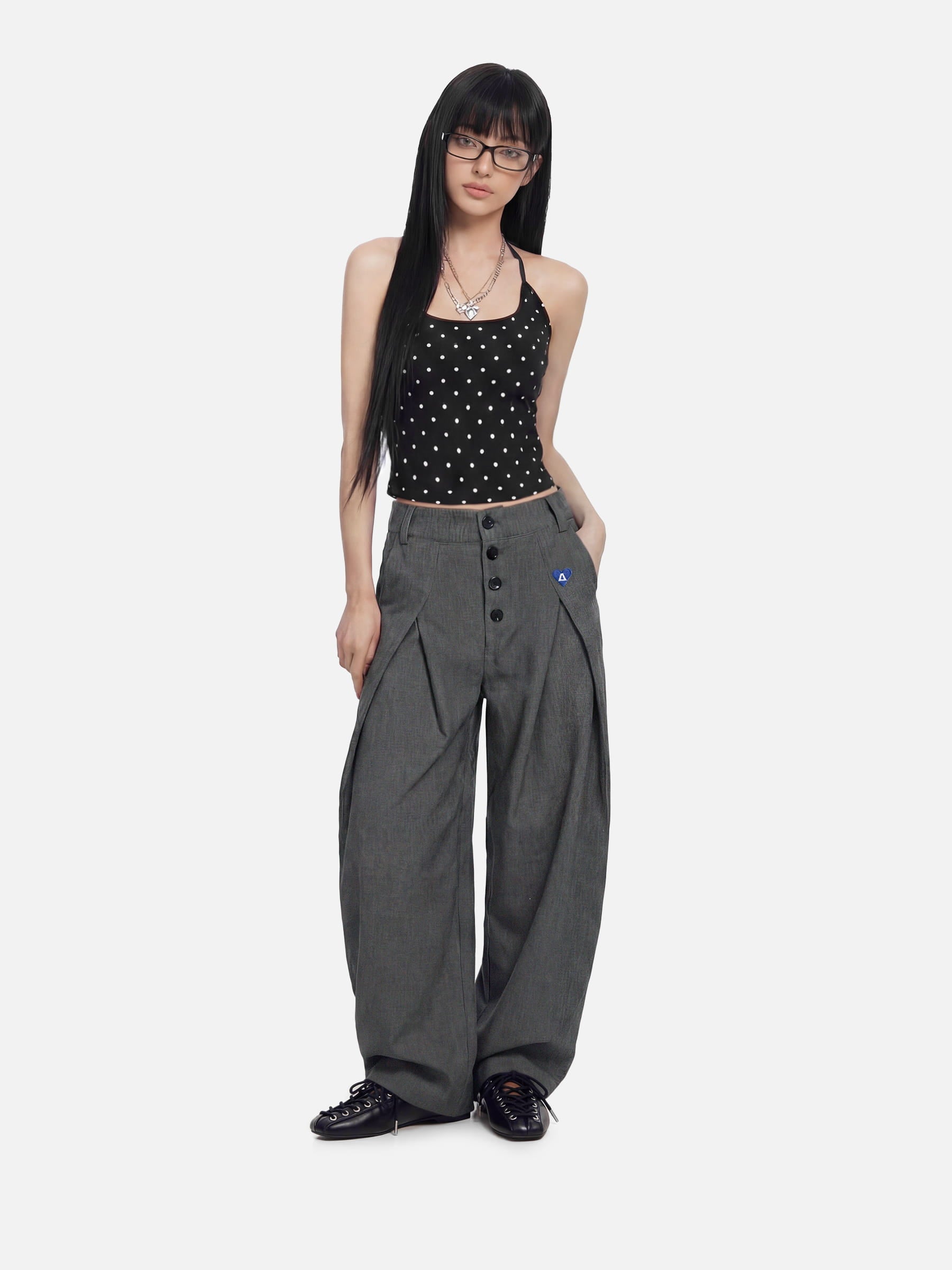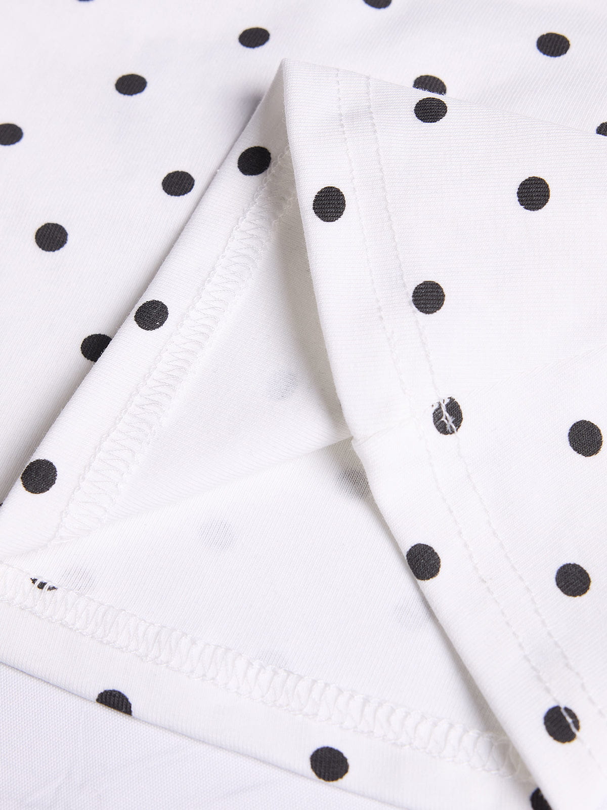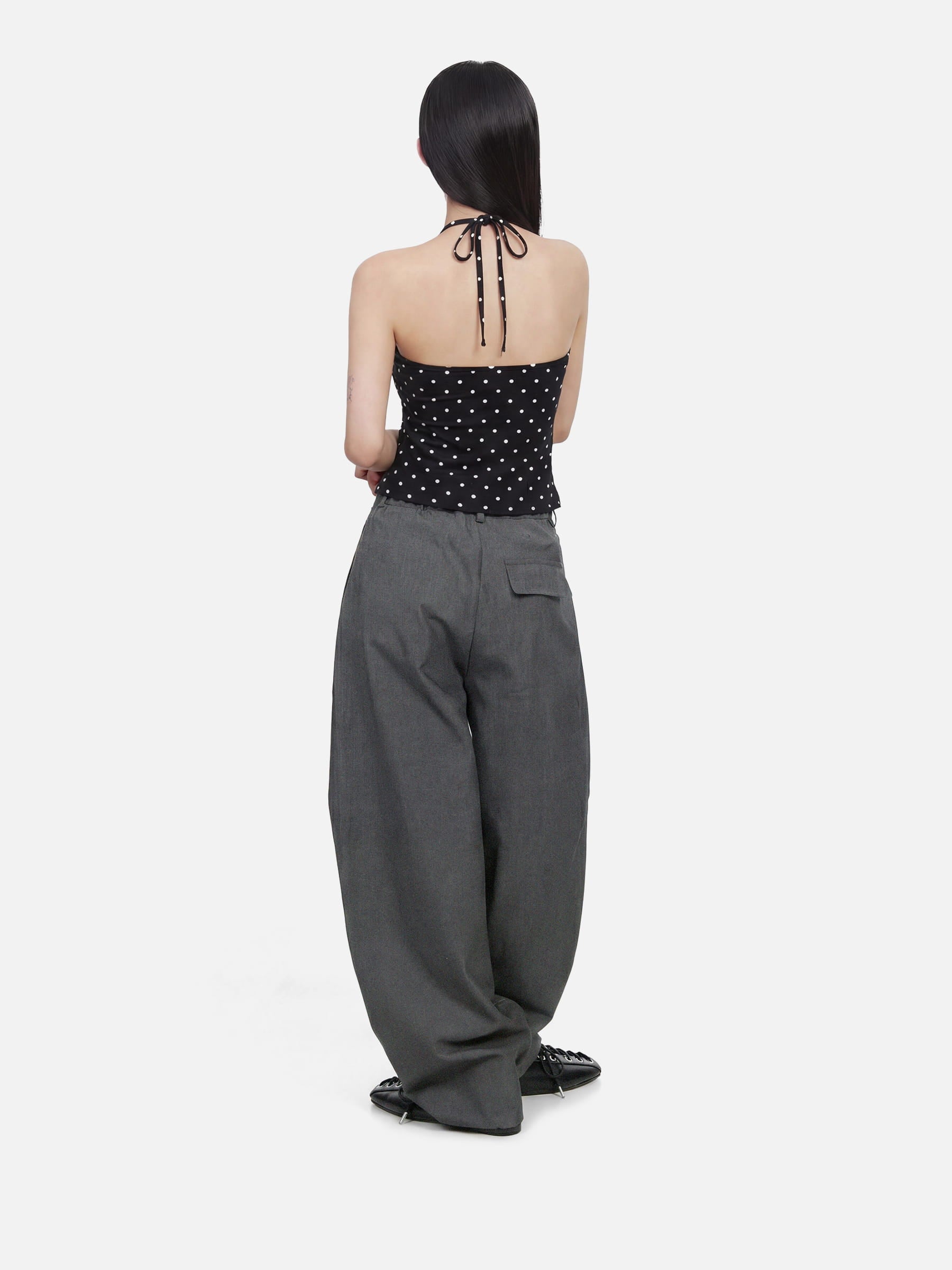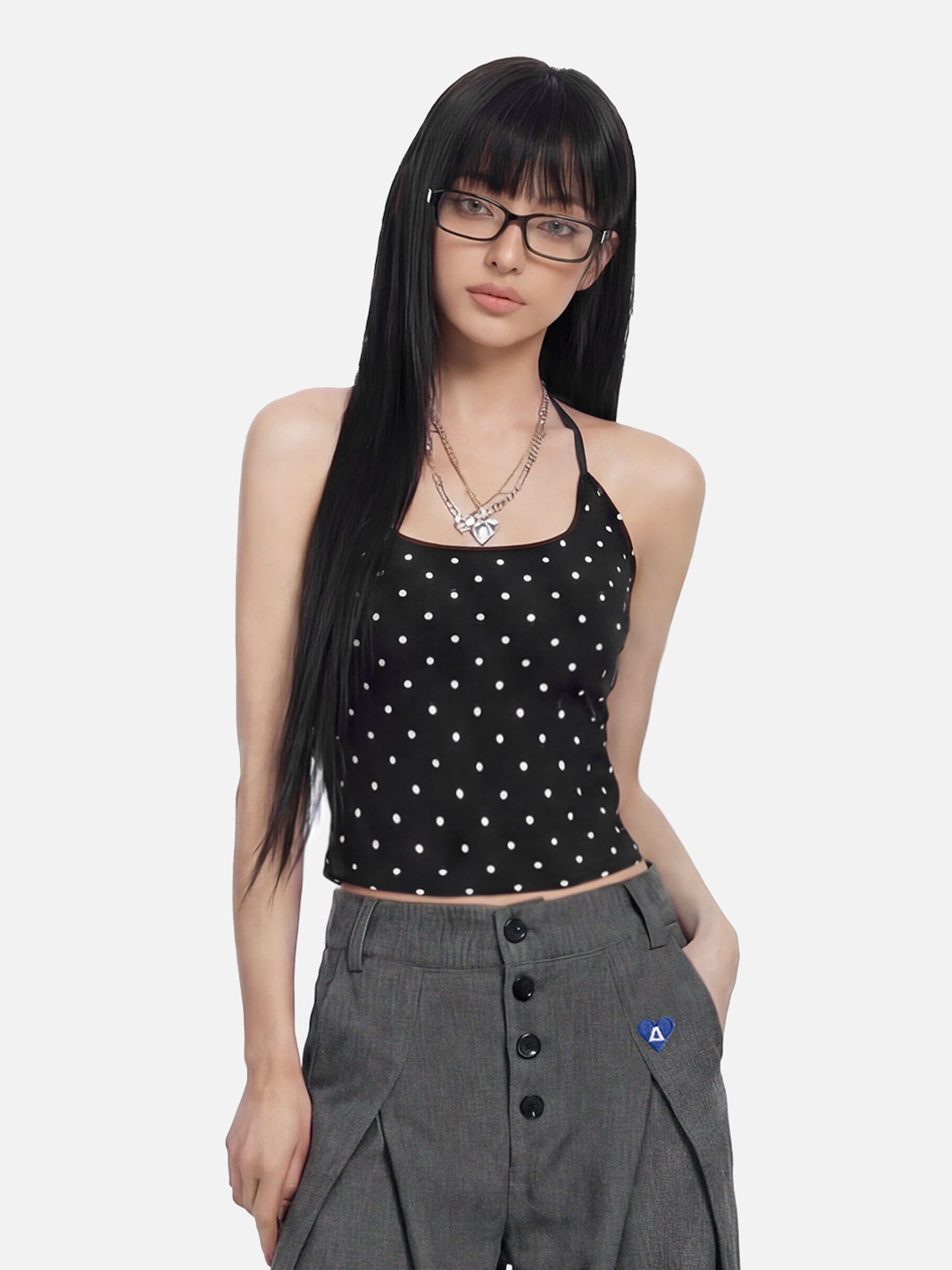 All-over polka dot print with a halter tie neckline. Fitted cami silhouette enhances shape while keeping a clean, retro-inspired look.