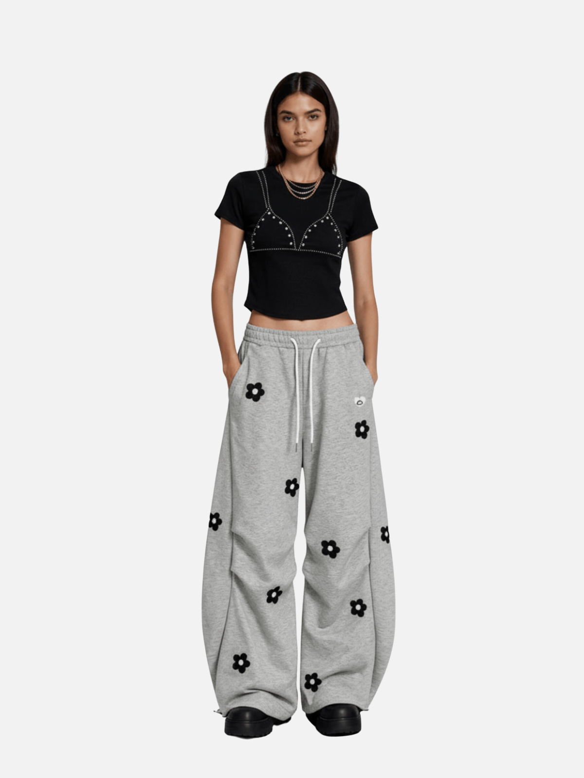 Rhinestone studs arranged in a bra-shaped outline across the front. Additional stud detailing runs along the strap lines and underbust curve, forming a structured decorative layout on the chest area.