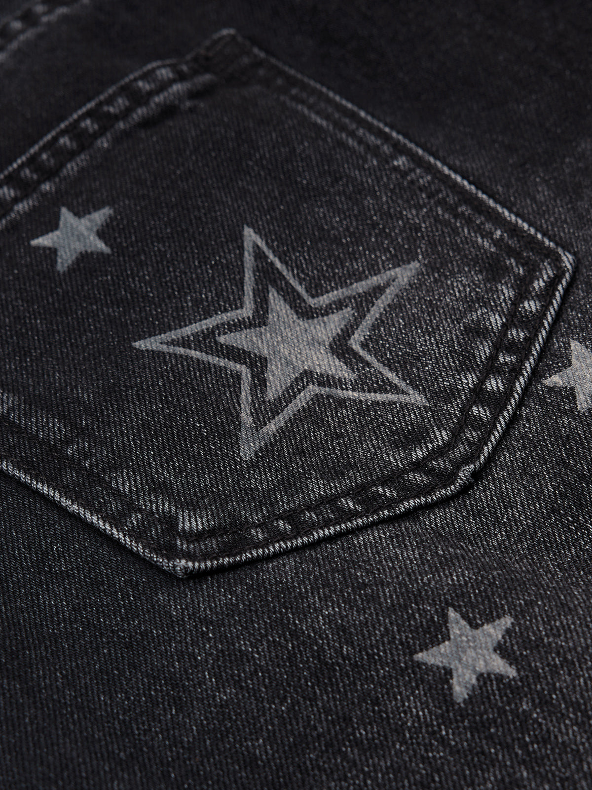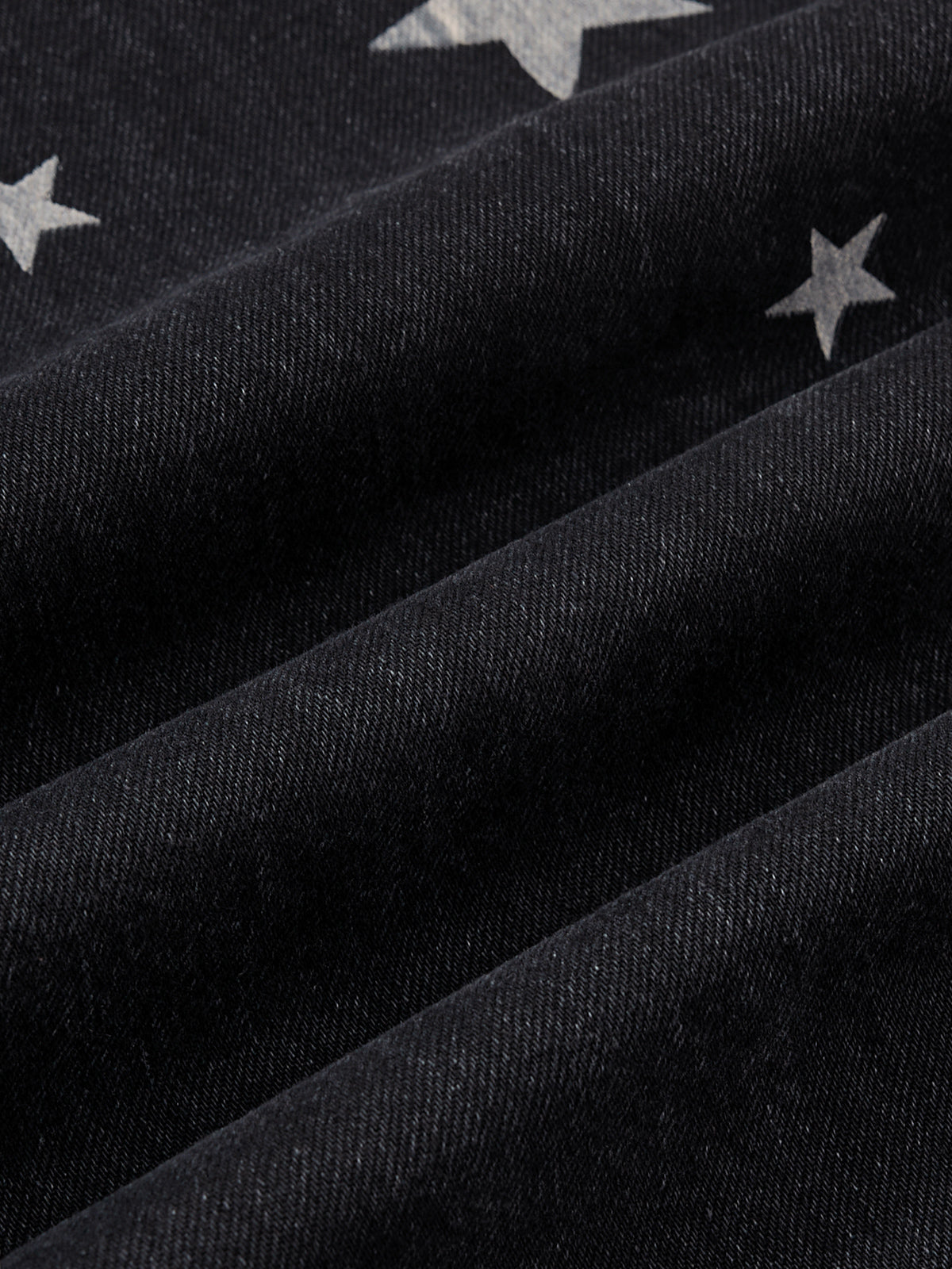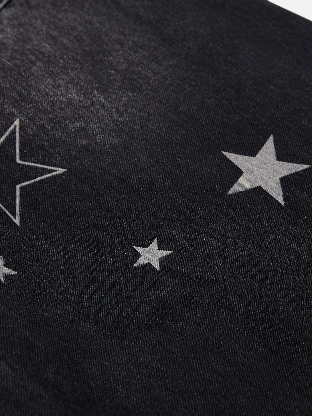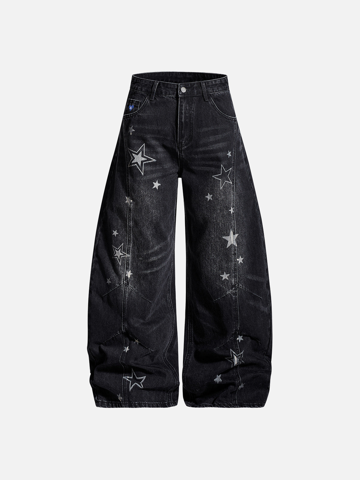 These Washed Whiskering Star Barrel Jeans feature bold graphic star accents that instantly elevate your denim game. With a relaxed barrel fit and distressed whiskering, they deliver both style and comfort for a confident, trendsetting look. Perfect for making a statement while enjoying effortless wear throughout your day.