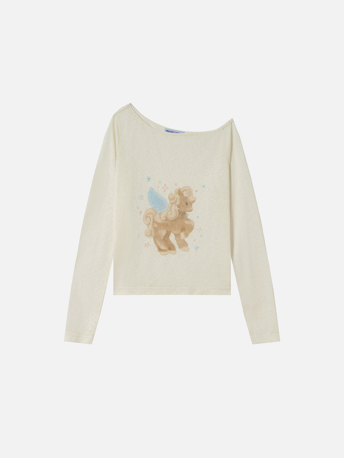 Designed with a soft-toned angel pony illustration at the center, this long sleeve tee highlights a gentle, storybook-inspired visual. The washed cream base enhances the muted color palette, while the clean neckline and extended sleeves maintain a minimal silhouette. A character-focused piece with a light, nostalgic mood.