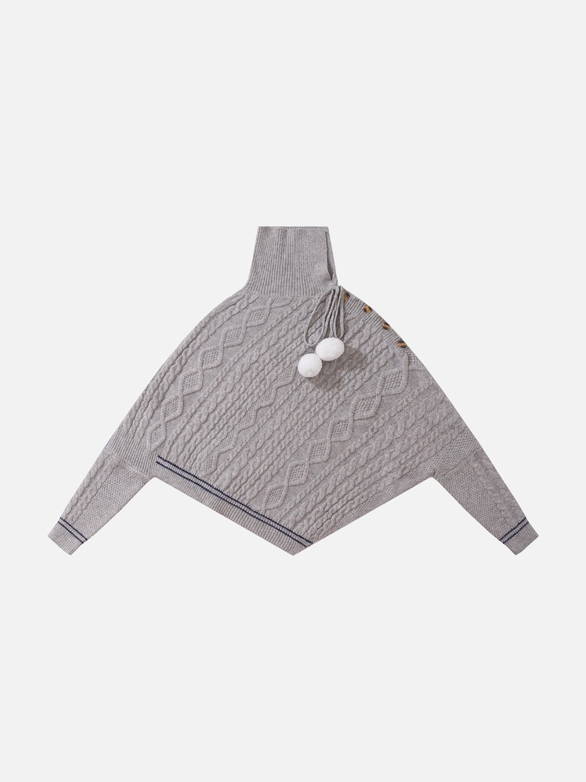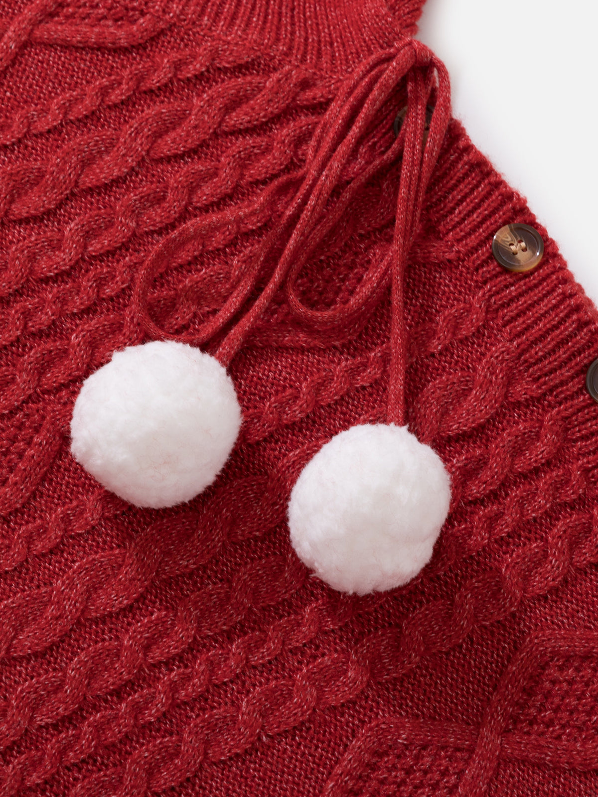 A playful twist on classic winter knitwear. This asymmetric cable-knit turtleneck pairs a dramatic angled hem with soft textured patterns for a statement silhouette that still feels cozy. The pom-pom ties add a lighthearted touch, while the rich red tone brings seasonal warmth. Unique, comfortable, and instantly eye-catching—an effortless way to elevate cold-weather outfits.