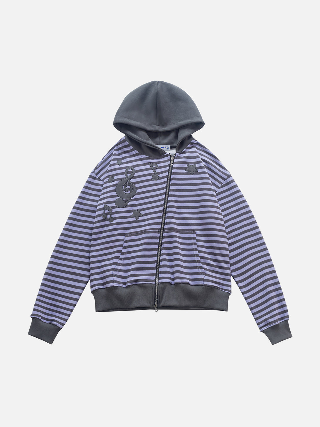 This boxy-fit zip-up hoodie blends playful stripes with an asymmetric zipper for a standout streetwear look. Textured appliqué graphics add dimension, while the relaxed silhouette delivers effortless comfort and personality in every outfit.