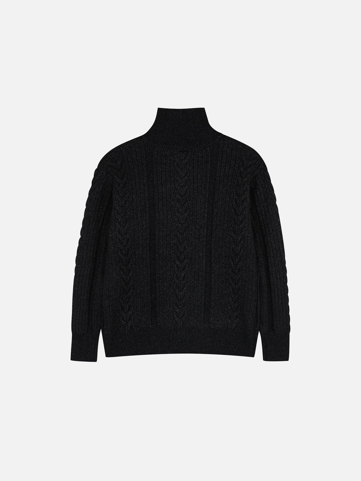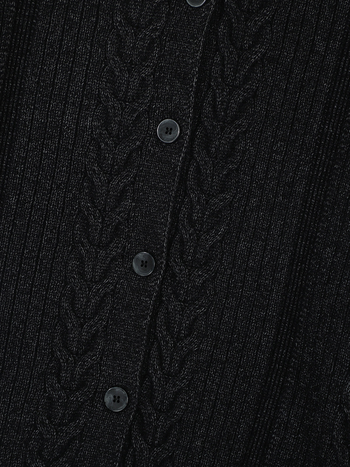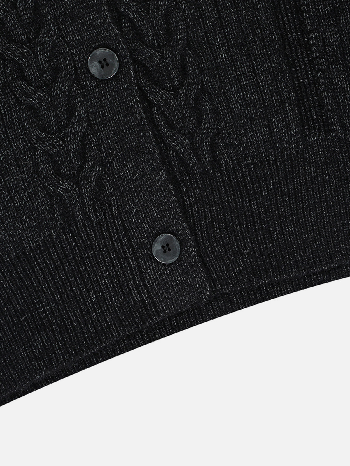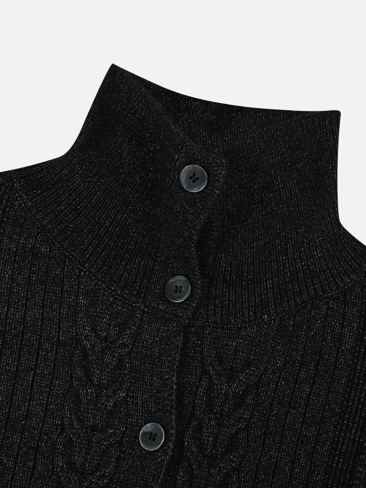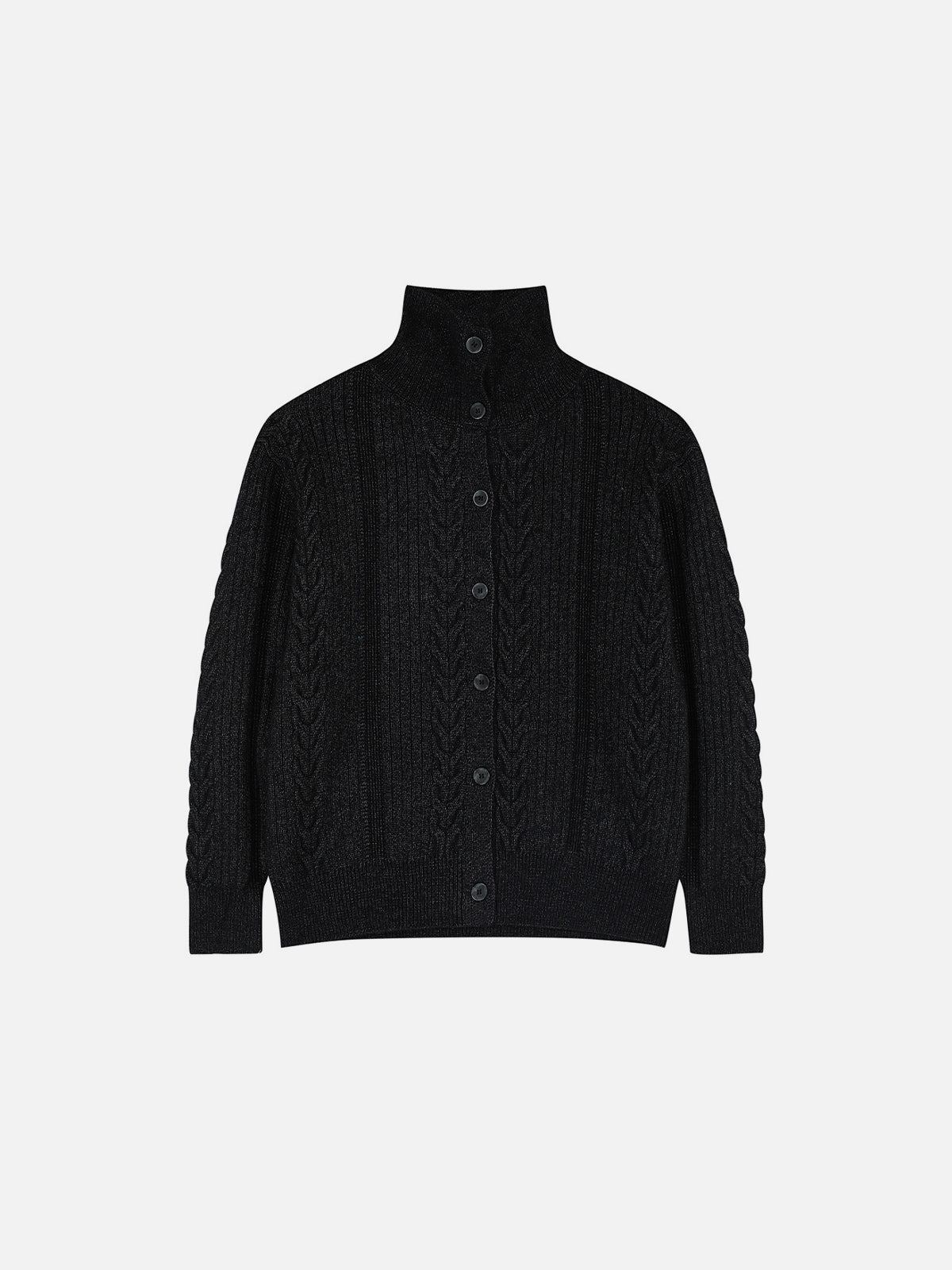 This cardigan features a classic cable-knit texture paired with a structured high-neck design, creating a balanced look that feels both refined and relaxed. The button-up front allows for flexible styling, whether worn fully closed for a clean silhouette or layered open for added dimension. Designed to deliver warmth, texture, and everyday versatility in one timeless knit piece.
