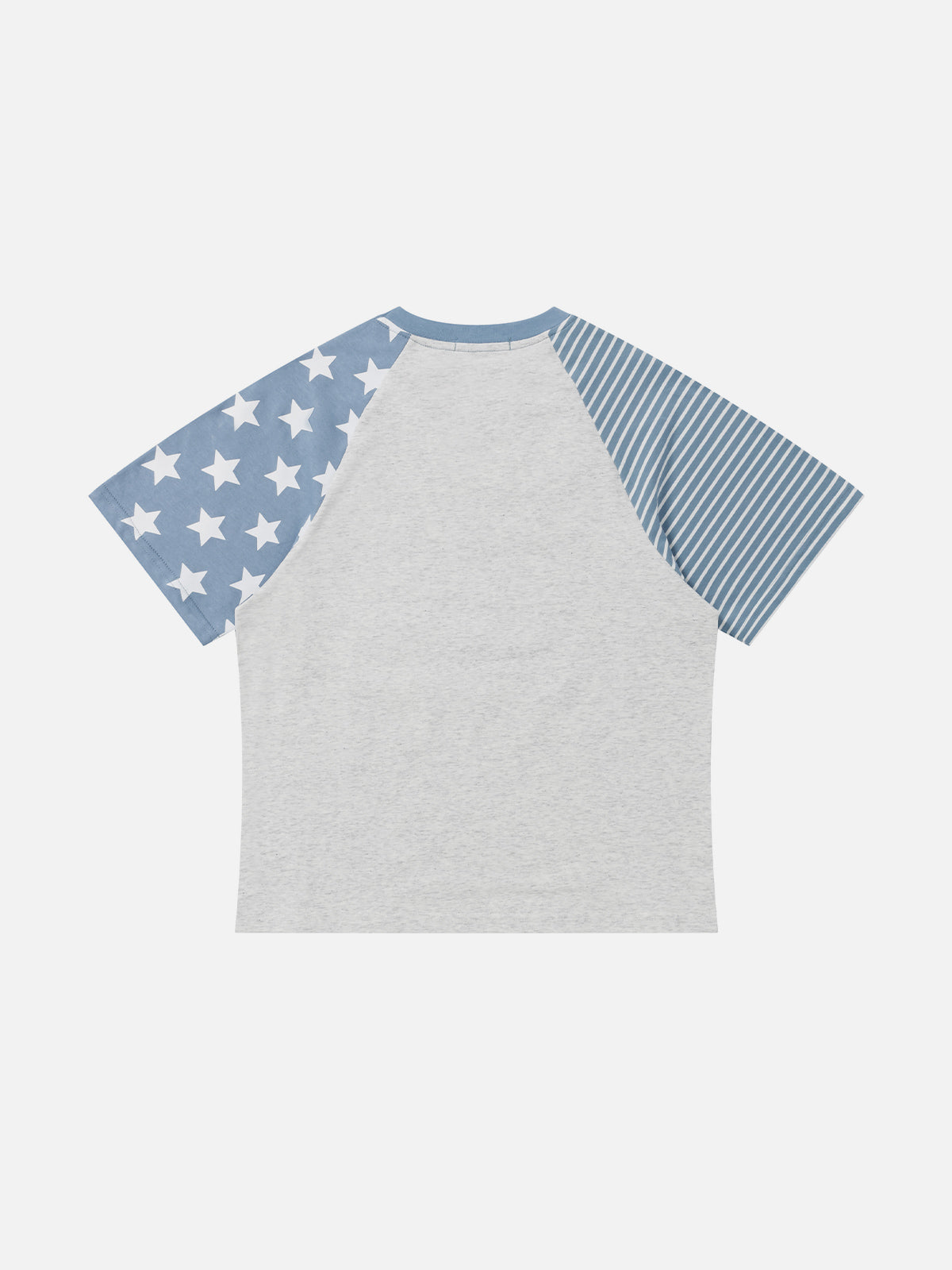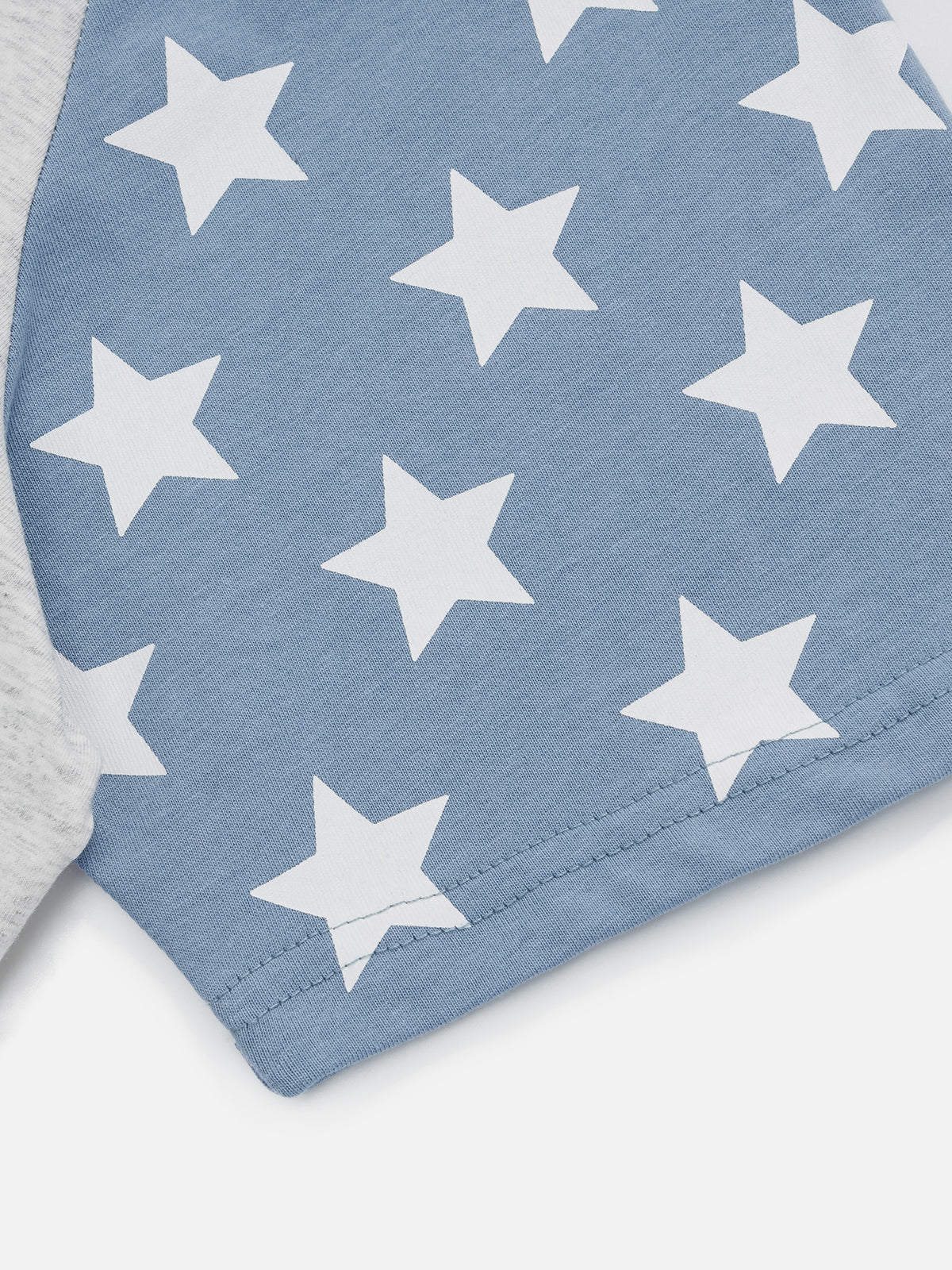 Designed with mixed stripe and star panel sleeves for a playful contrast. The center graphic features a soft-focus kitten layered with handwritten blue lettering, creating a light, collage-style visual. Clean base tone keeps the composition balanced and easy to style.