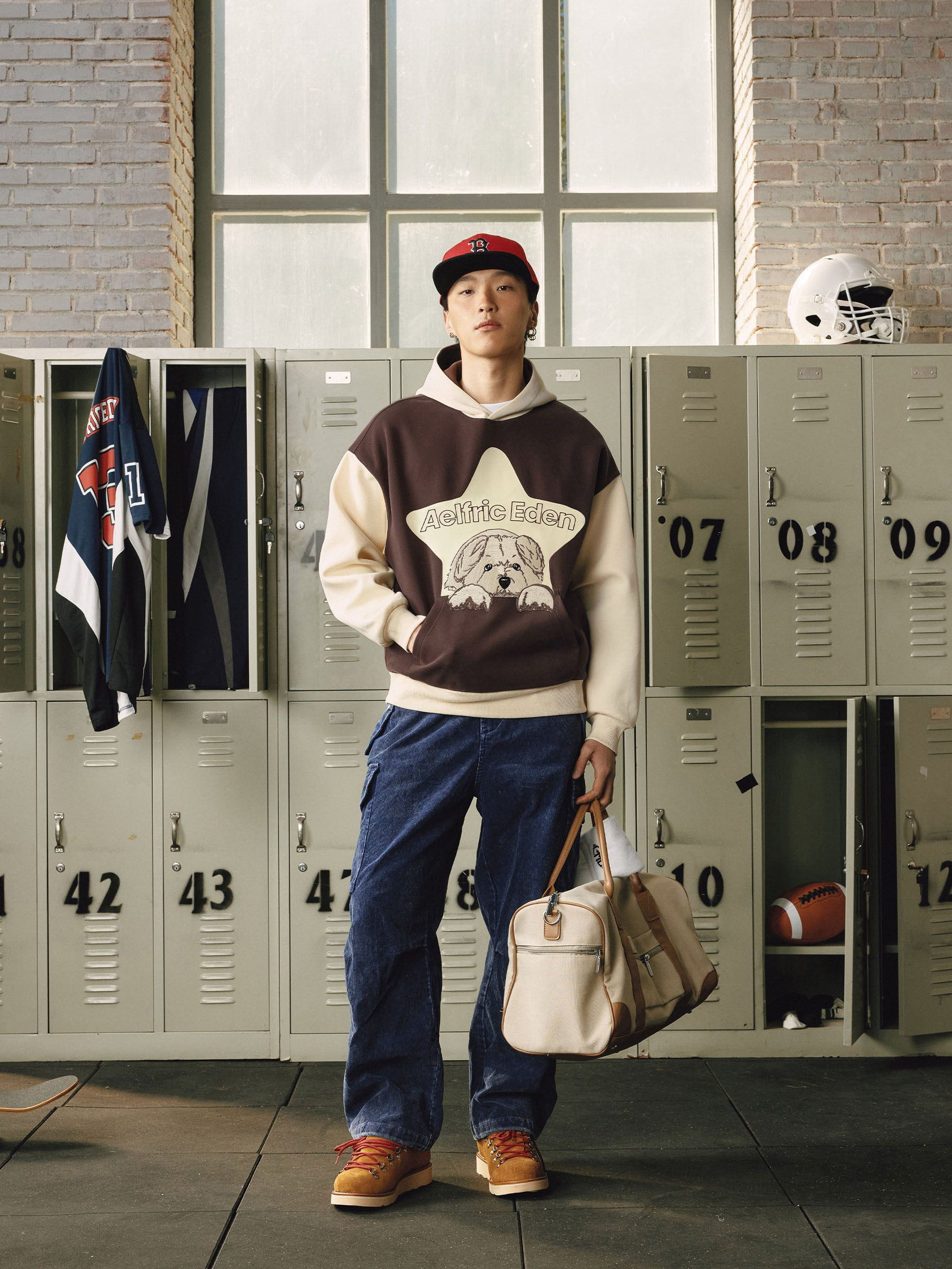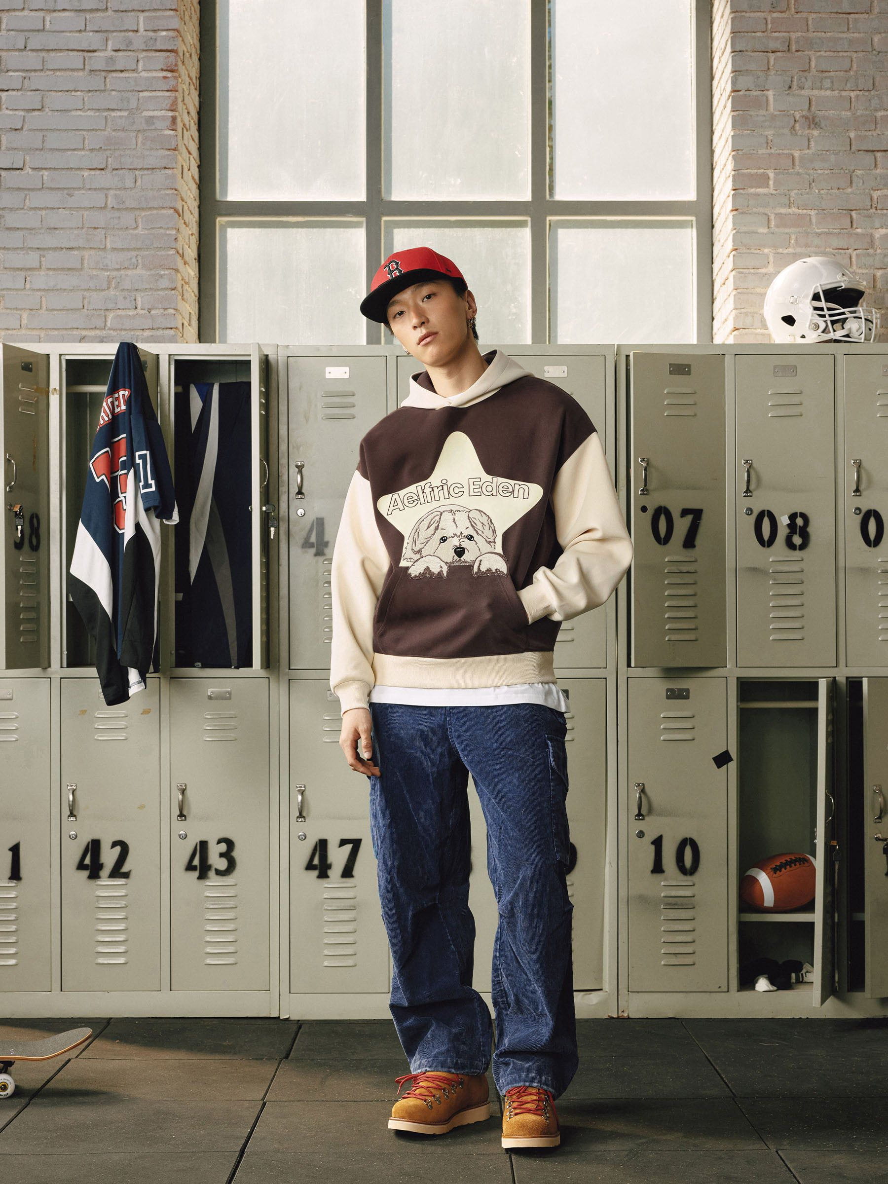 Aelfric Eden – Kapuzenpullover mit Cartoon-Hund im Farbblockdesign