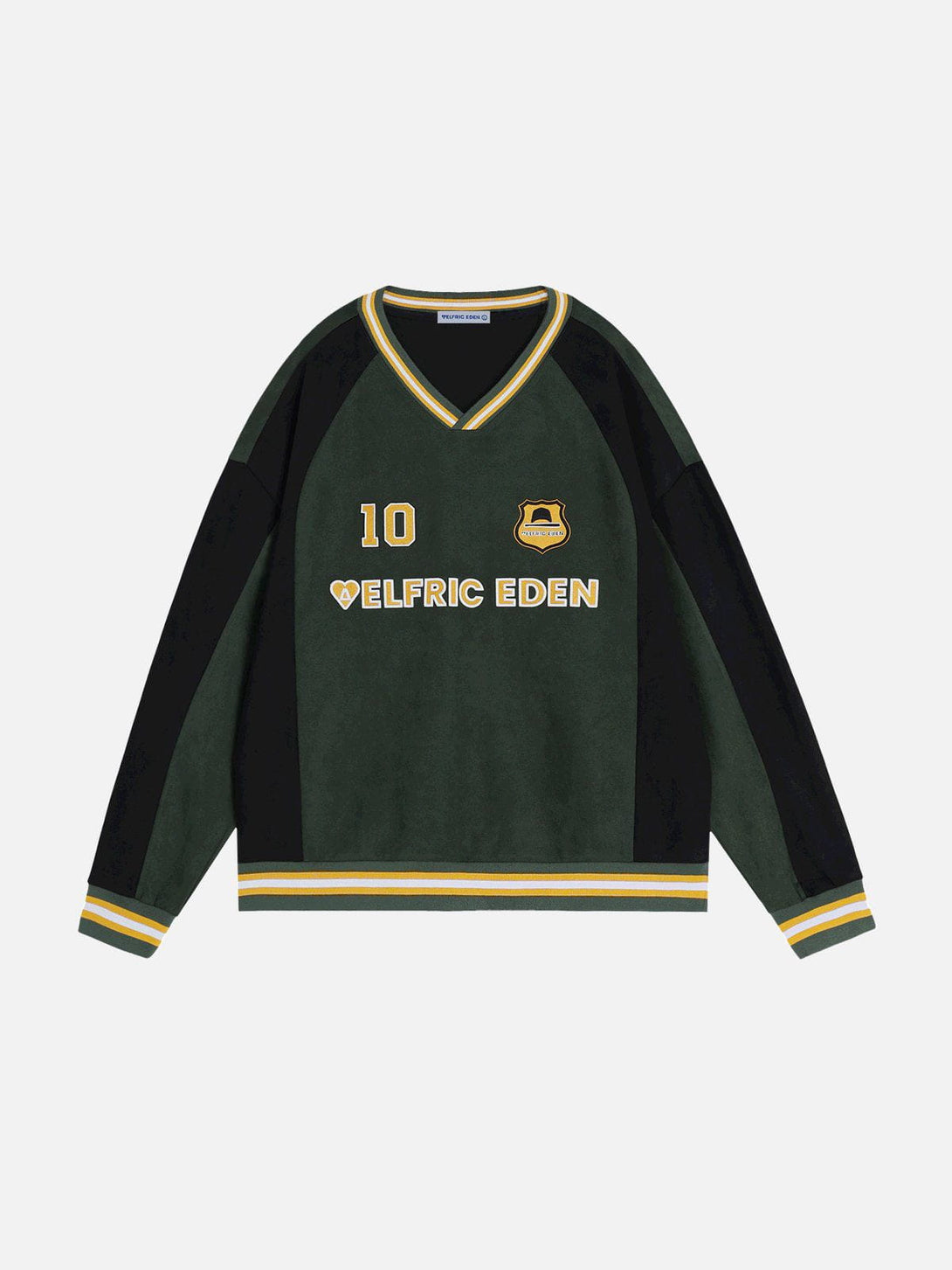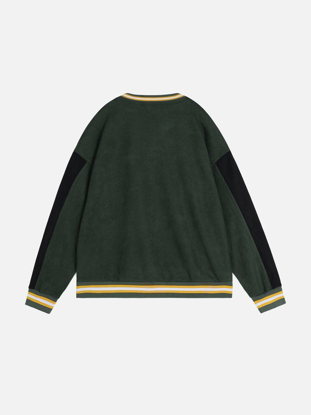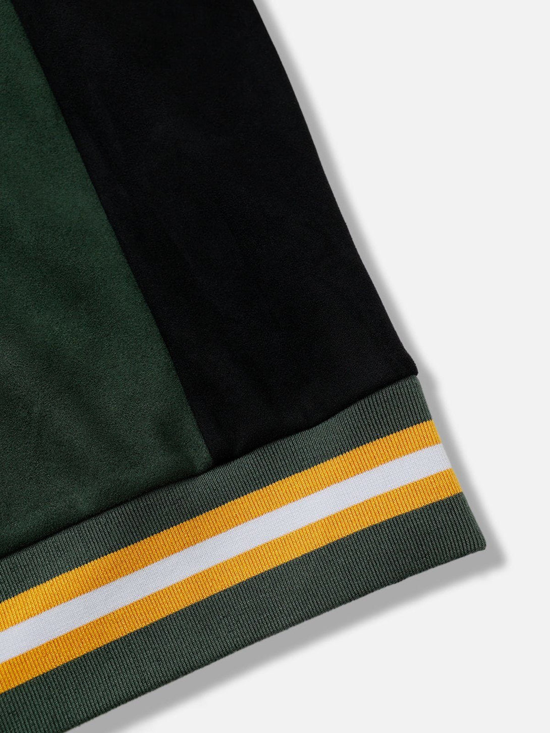 This sweatshirt features a bold color-blocking design with contrasting green and black tones, complemented by embroidered details for added texture and style. Crafted from soft suede fabric, it offers a luxurious feel and a relaxed fit.?