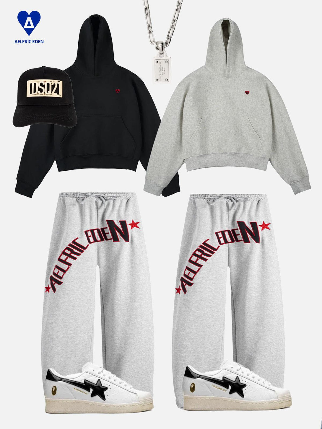 These light grey baggy sweatpants feature bold red-and-black arched embroidery reading ¡°Aelfric Eden,¡± accented with star motifs. With an elastic waistband and cuffs, they offer both statement style and relaxed comfort.