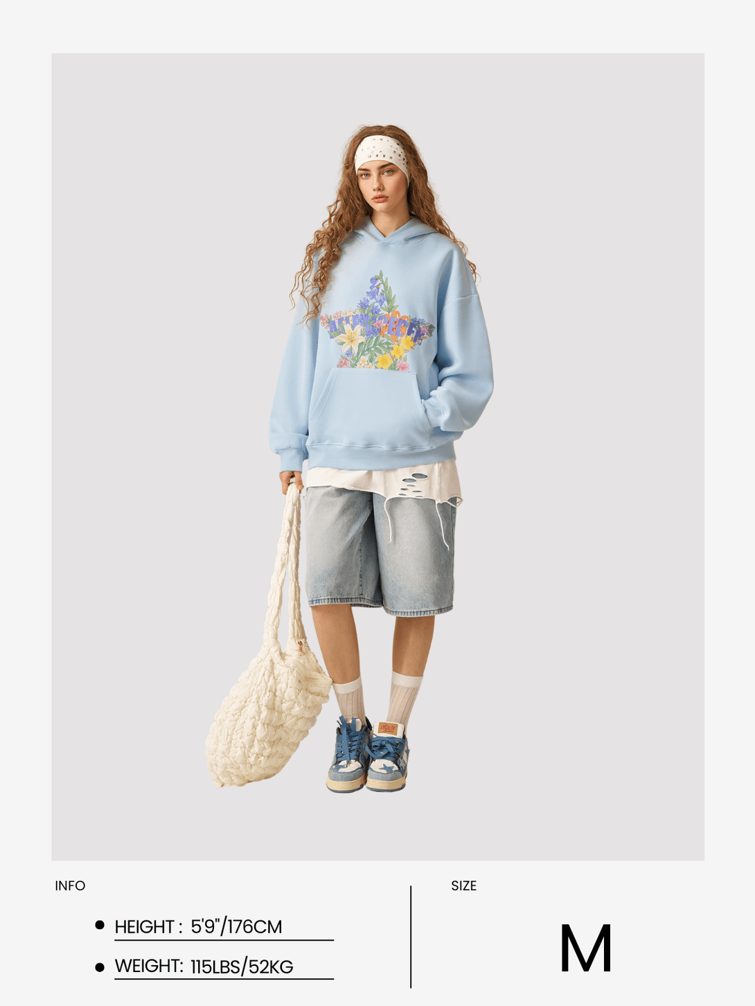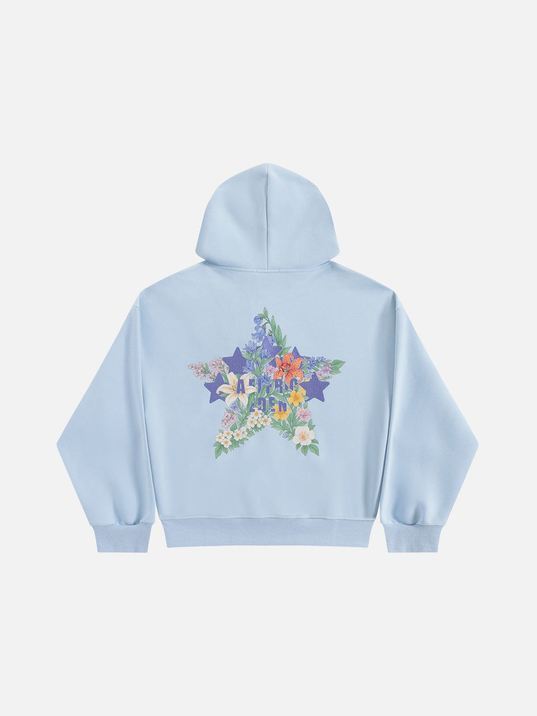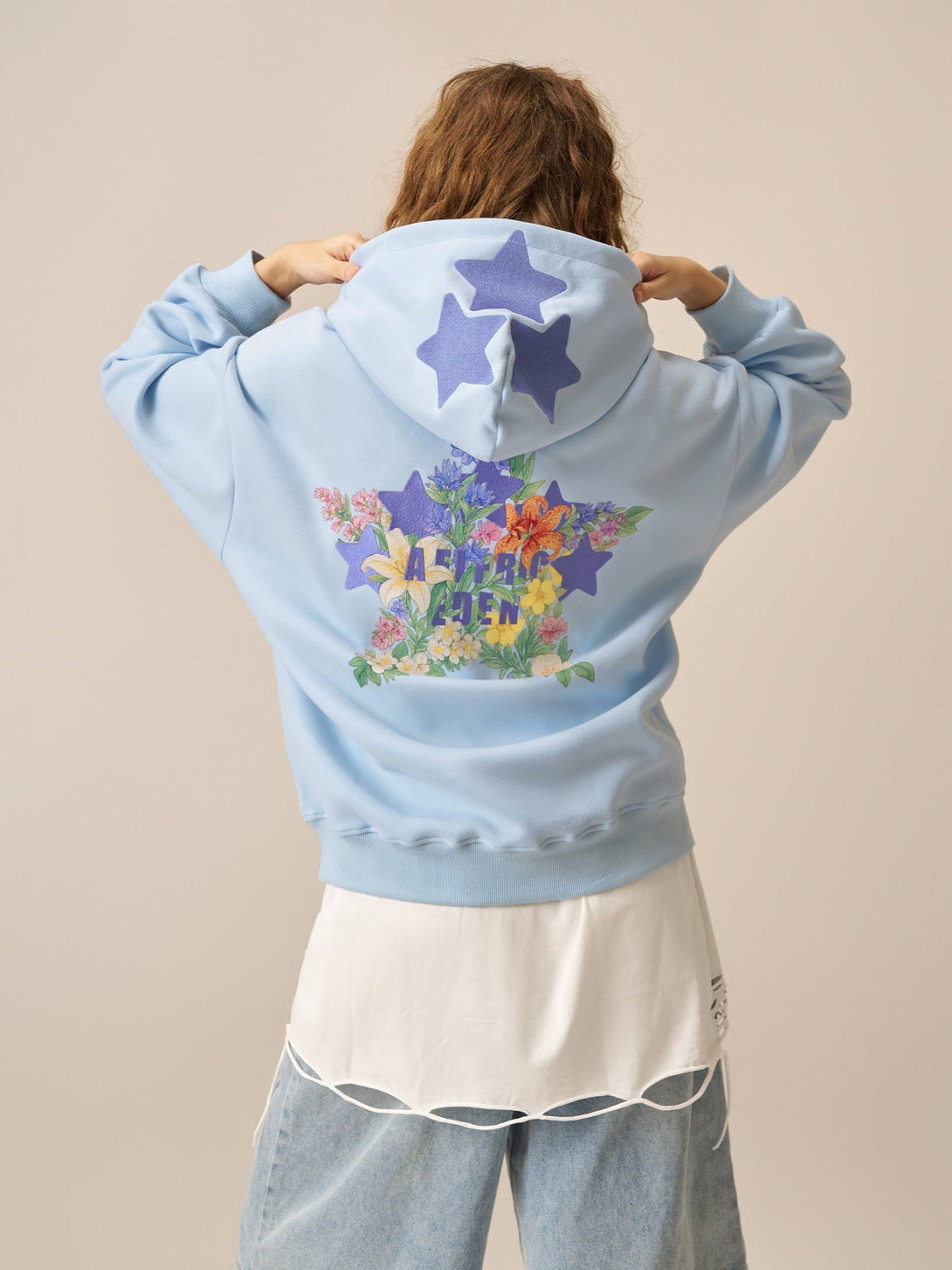 Soft color meets whimsical charm in this pullover hoodie, featuring vibrant floral graphics intertwined with bold lettering. Three playful purple stars crown the hood, adding a pop of contrast. A cozy, artistic layer that balances comfort and creativity.