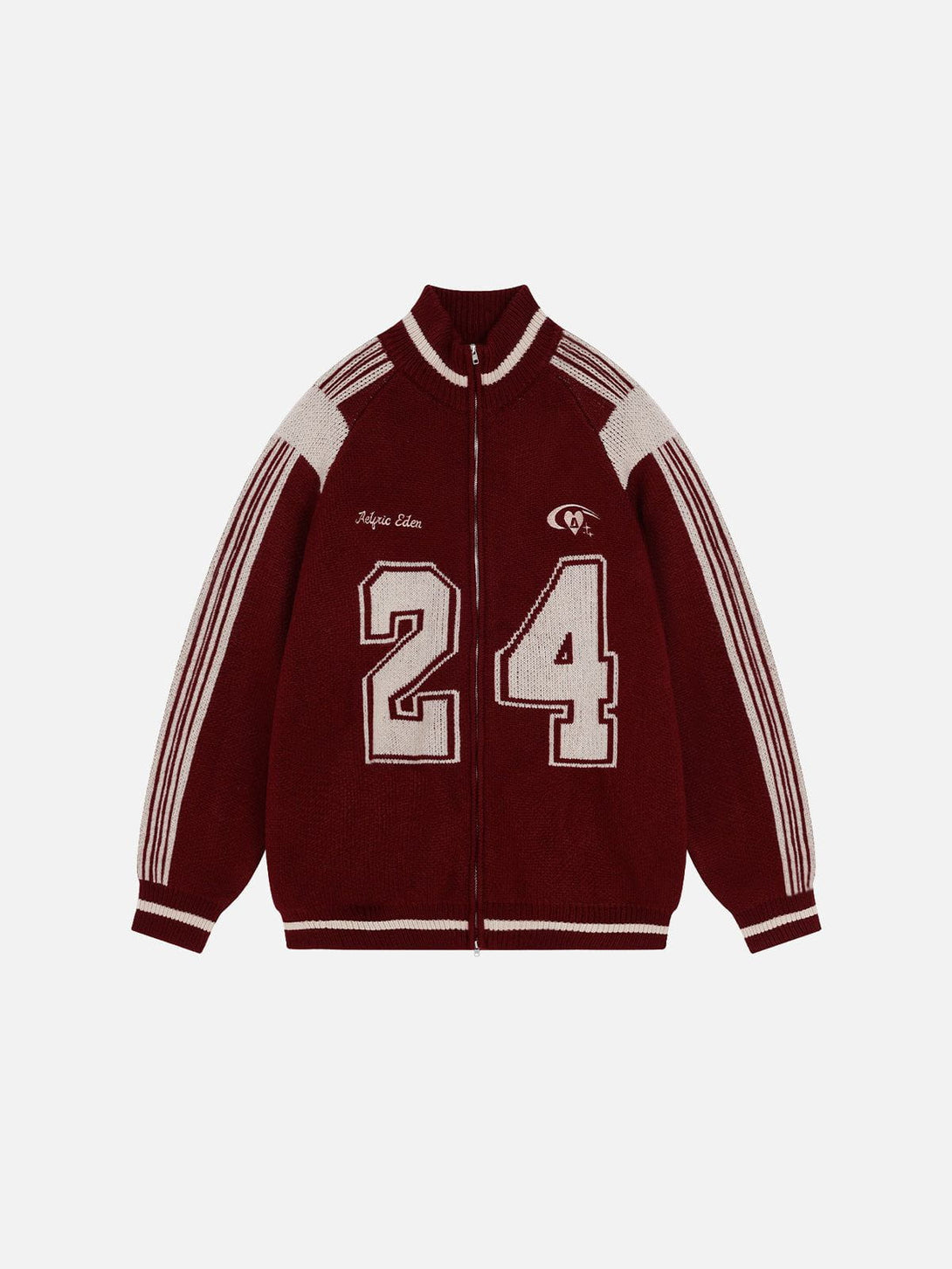 Der Aelfric Eden Number Jacquard Cardigan zeichnet sich durch eine einzigartige weinrote Farbe aus, gepaart mit Vintage-Zahlen-Jacquardmustern, die eine natürliche, entspannte und sportlich-lässige Ausstrahlung betonen.