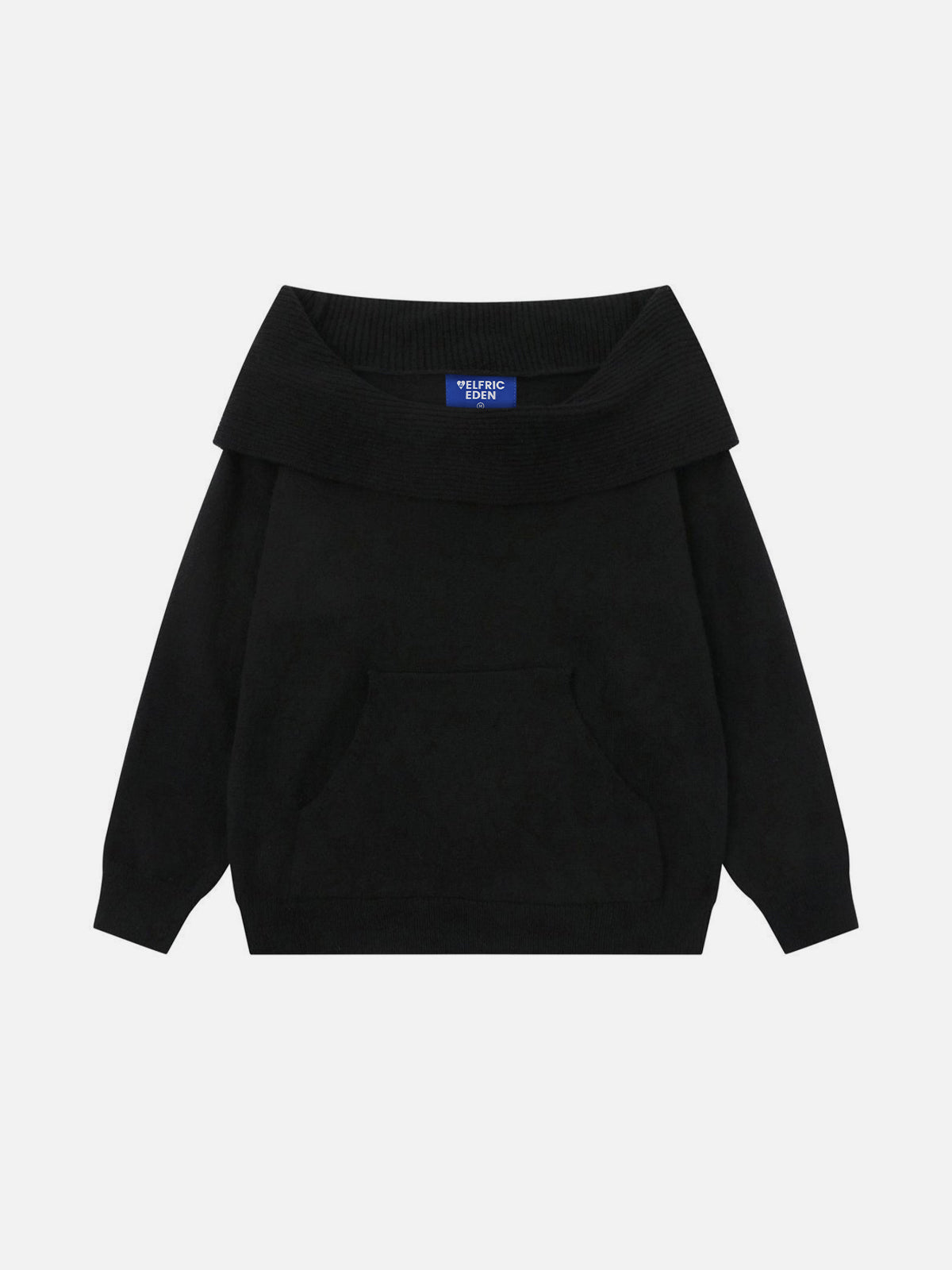 This off-the-shoulder hooded sweater features a wide ribbed neckline that creates a relaxed, draped look. Crafted from soft knit fabric, it provides a comfortable wearing experience while maintaining a clean structure. The design is finished with a front kangaroo pocket and ribbed cuffs and hem for practical everyday use.