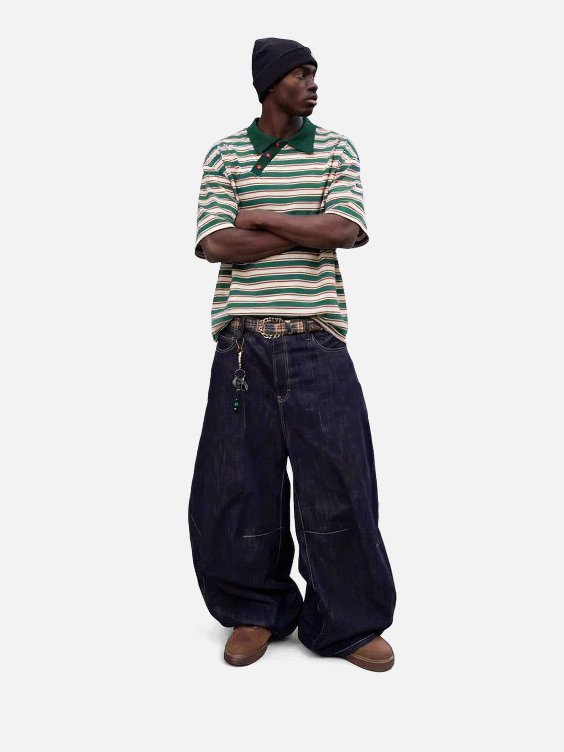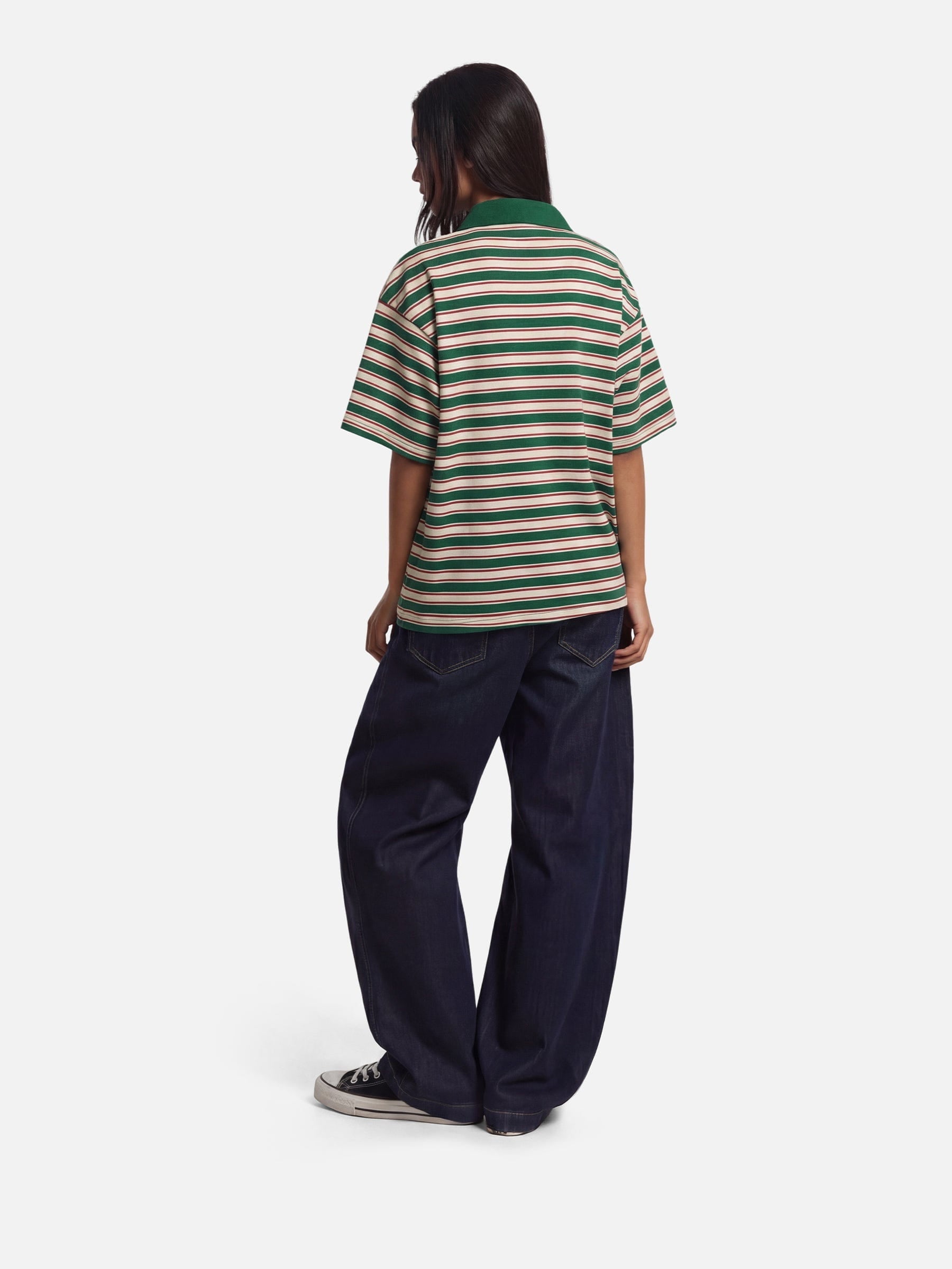 Horizontal stripes bring a retro rhythm to this polo-inspired tee. Finished with a contrast collar and button placket, it balances structure and ease. Soft to the touch and easy to style, it works solo or layered, delivering a clean vintage feel for everyday rotation.