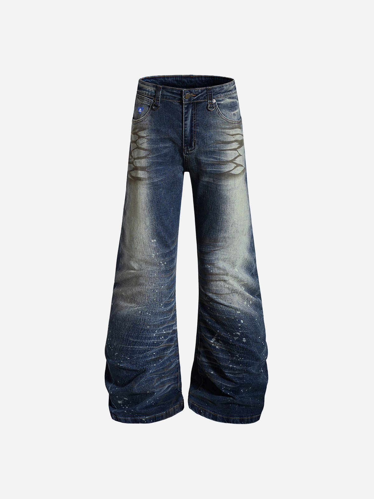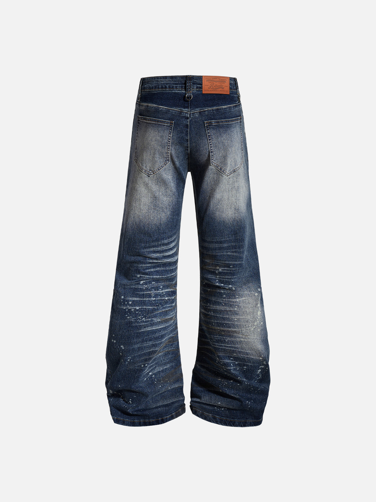 Cut in a bootcut silhouette, these jeans feature heavy washed fading with whisker detailing and paint splatter accents that build layered depth across the leg. Subtle abrasion and shadowed thigh treatments create a worn-in contrast, while the gradual flare from knee to hem elongates the lower line. Structured denim keeps the shape defined, making it easy to balance with fitted tops or cropped outerwear for a sharper proportion.