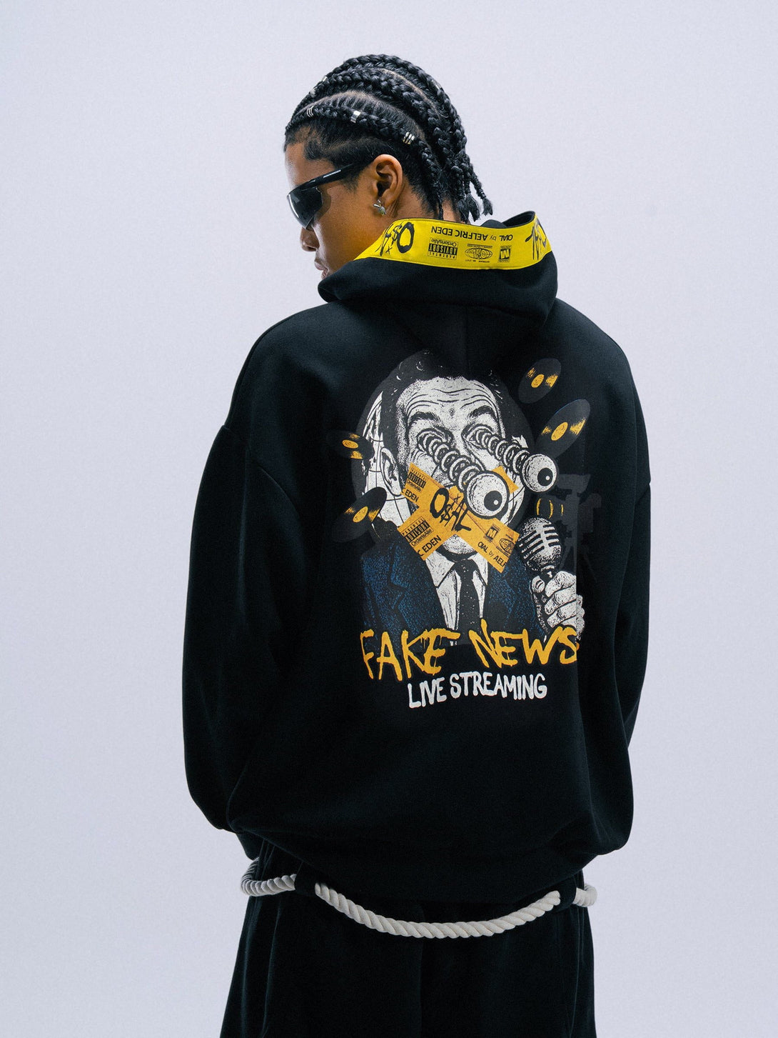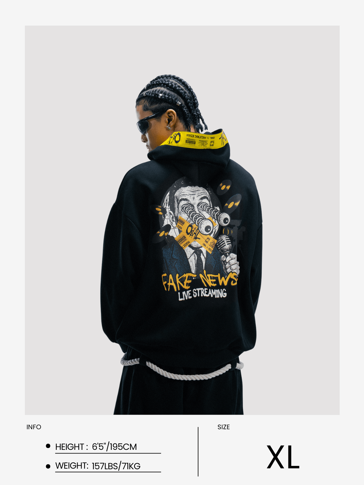 Make your look stand out with the Fake NEWS Hoodie. Featuring an oversized fit for relaxed streetwear style, this hoodie shows a playful news-inspired graphic that adds personality and visual edge.